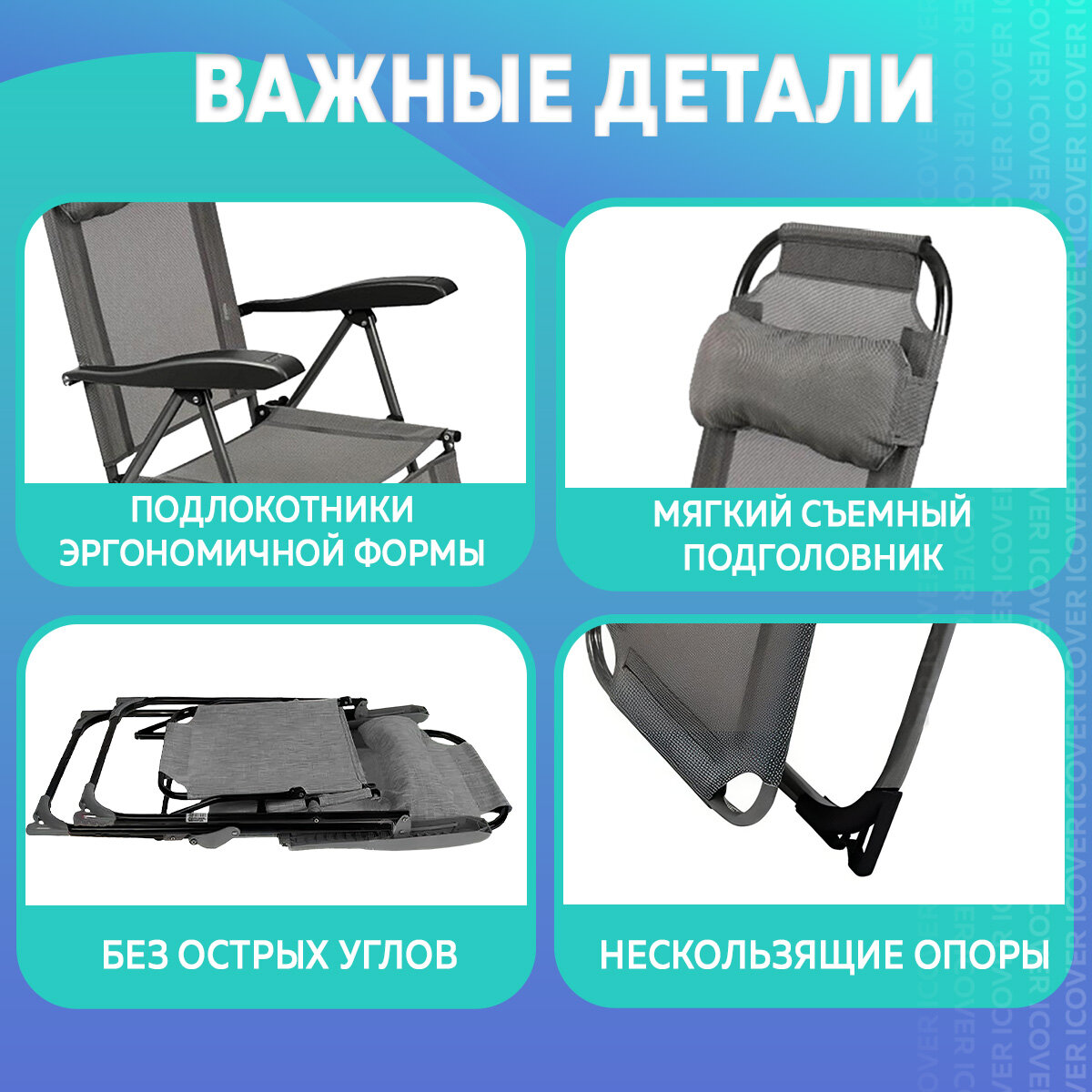 Сидеть очень удобно, даже после того как их намочешь быстро высыхают. Во время беременности спина в них отдыхала. Регулировка ручками. Каркас надёжный. Расцветки приятные. Пластик качественный. Подушку можно спускать под спину. Легко моется. Ножки не тонут в землю или песок. |