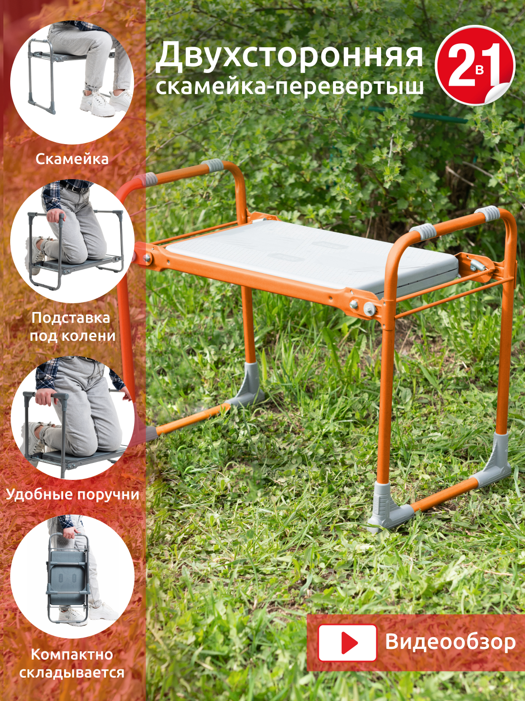 Скамейка оранжевого цвета хорошо заметна на участке. Прочная, лёгкая , удобная для переноски , имеются рукояти, за которые удобно ее держать. быстро складывается и раскладывается. Использую скамейку для множества целей. Можно сидя пропалывать грядки , а если перевернуть, то стоя на коленях. Использую как подставку , на которую можно встать и собирать вишни, сливы, яблоки, груши и т д . В яркий солнечный день , перемещаюсь с данной скамейкой как с сумочкой , по всему саду и ищу тень . Сбоку имеются поручни, на которые можно повесить различные инструменты, которые нужны для работы в саду, например , секатор, нож, и тд .В разобранном виде занимает совсем мало места. Не боится влаги, если оставите ее на улице. Советую приобретать такую скамейку , вы не пожалеете. Я очень довольна. Использовала все лето и осень. Оценка 5 |