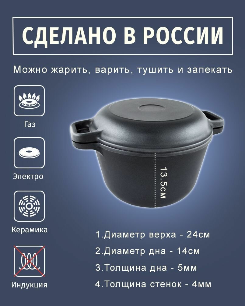 Казан алюминиевый нева металл посуда Литой с крышкой-сковородой, черный, 5 л