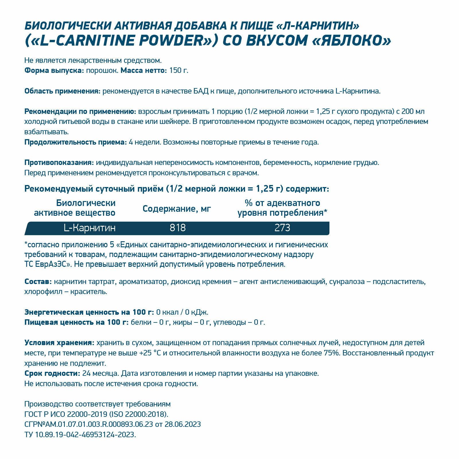 Л-карнитин для похудения L-Carnitine порошок 150 г Яблоко
