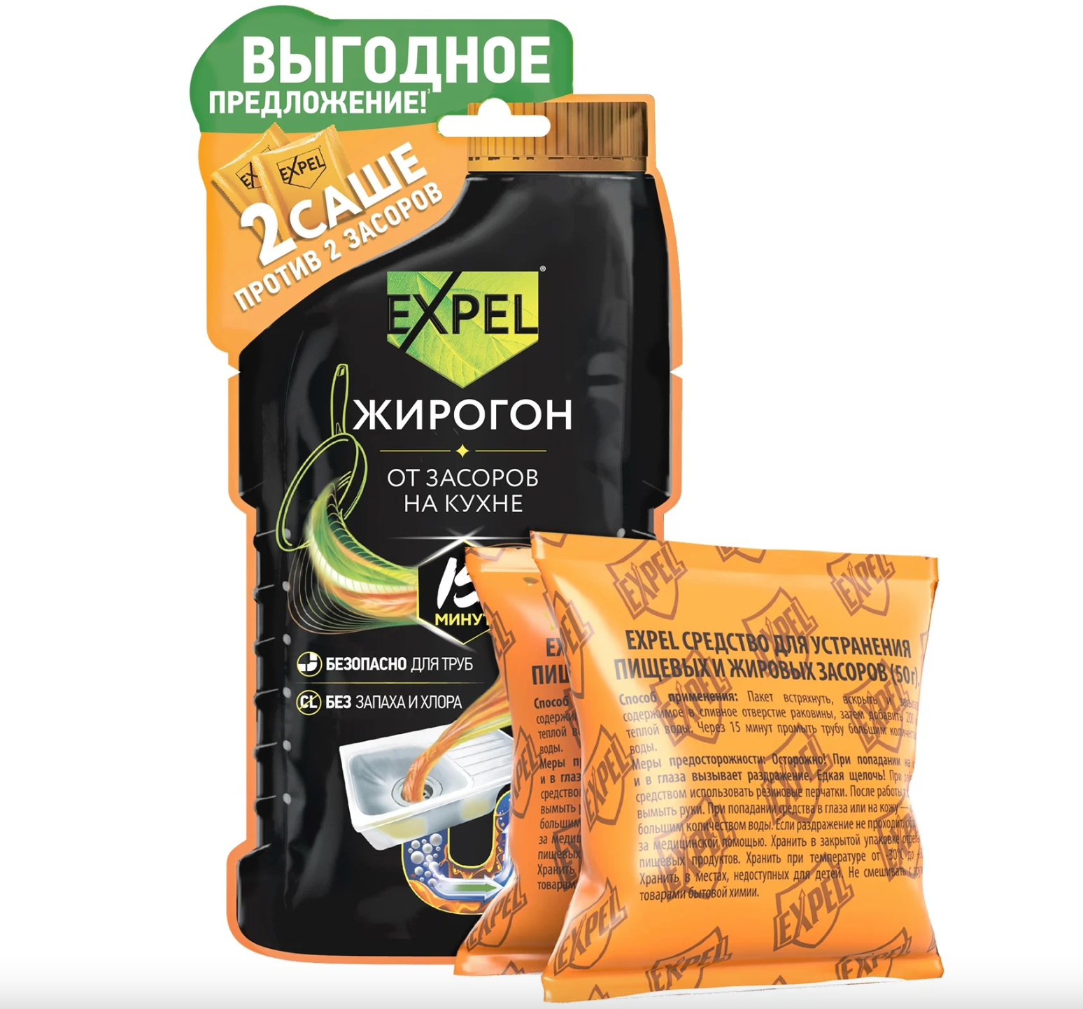 Средство для устранения засоров, EXPEL жирогон, от жира и пищевых остатков 2 саше по 50г