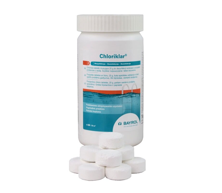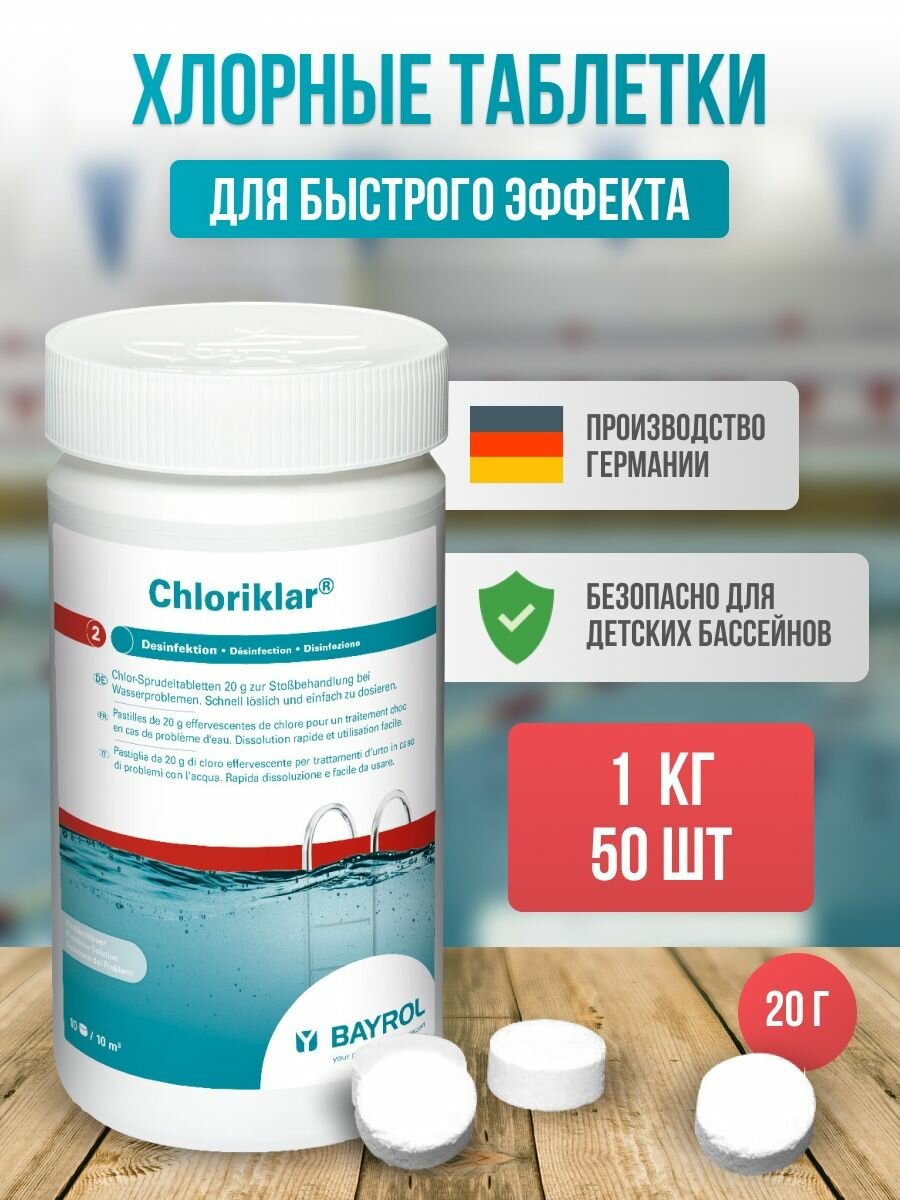 Chloriklar (1 кг) Bayrol: Быстрорастворимые хлорные таблетки для бассейна по 20 г Хлориклар