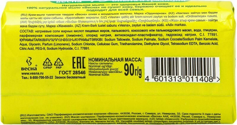 Мыло туалетное Весна Олива и миндальное молочко, бумажная обертка, 90г ( Артикул 273973 )