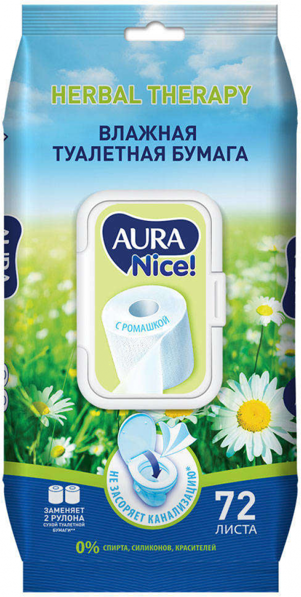 Aura Nice! Туалетная бумага влажная с ромашкой, 0% спирта, силиконов, красителей (72 листов, 190 х 120 мм)