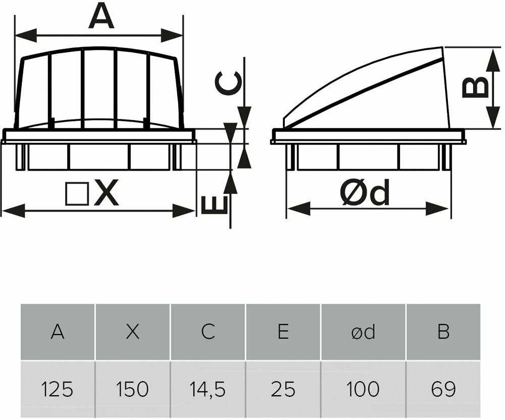 ERA 1515К10ФВ сер Эра. Выход стенной вытяжной с обр. клапаном 150x150 с фланцем D100, серый, ASA-пласт 88-062