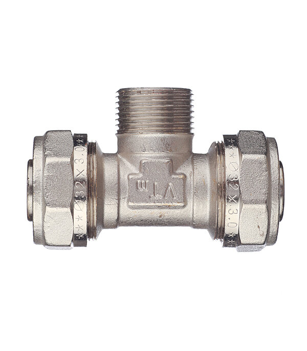 Тройник обжимной 32 мм х 1 1/4" НР х 32 мм для металлопластиковых труб 32(3,0) VALTEC / Латунный фитинг под обжим с переходом на наружную резьбу ДУ32, арт. VTm.333.N.320732