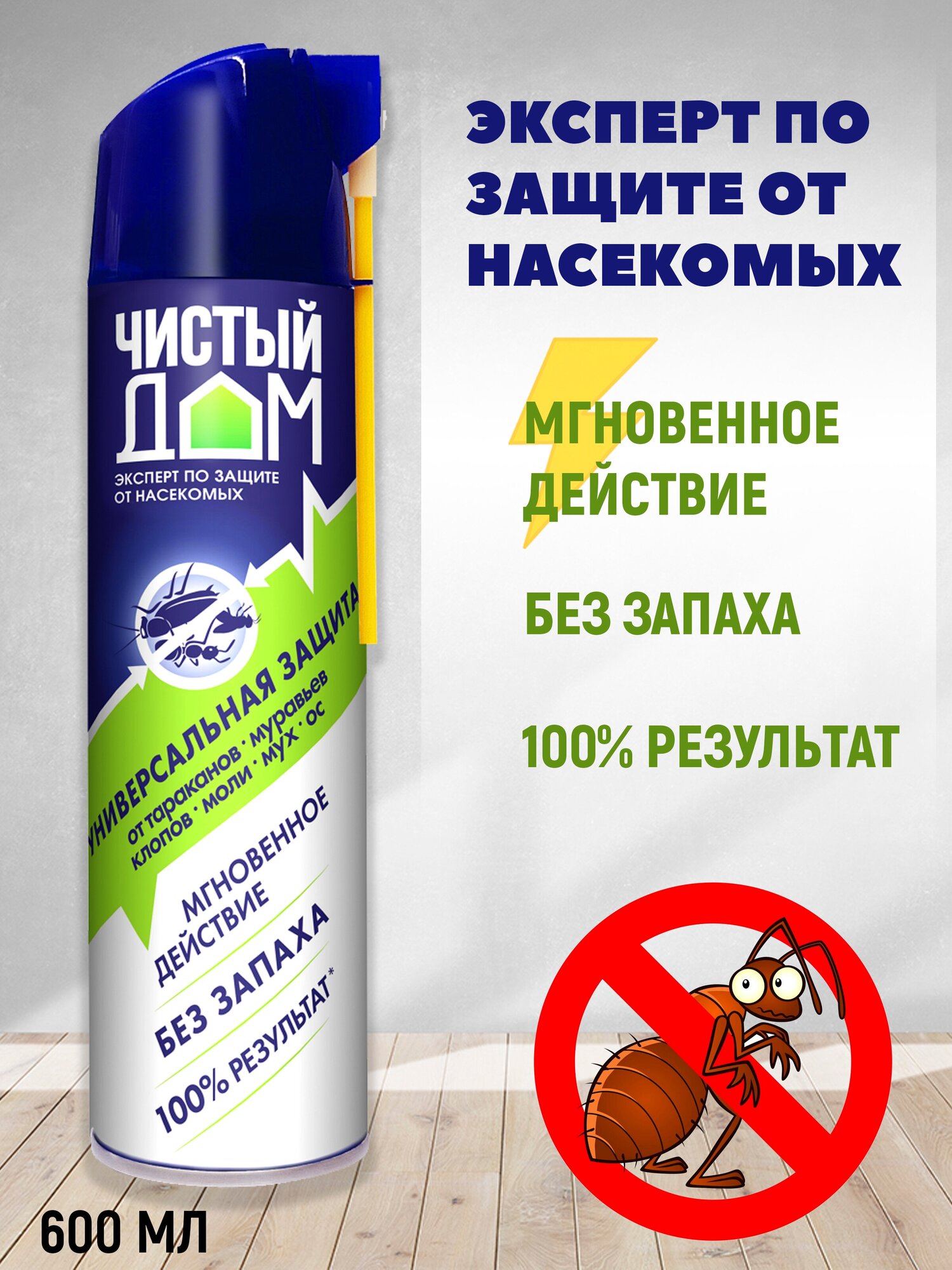 Чистый дом, универсальный аэрозоль от клопов, тараканов, блох, муравьев, мух, ос 600 мл