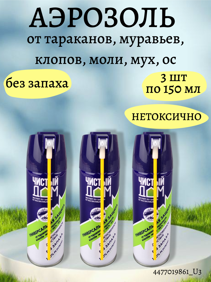 Аэрозоль от тараканов, муравьев, клопов, моли, мух, ос, 150 мл, 3 штуки