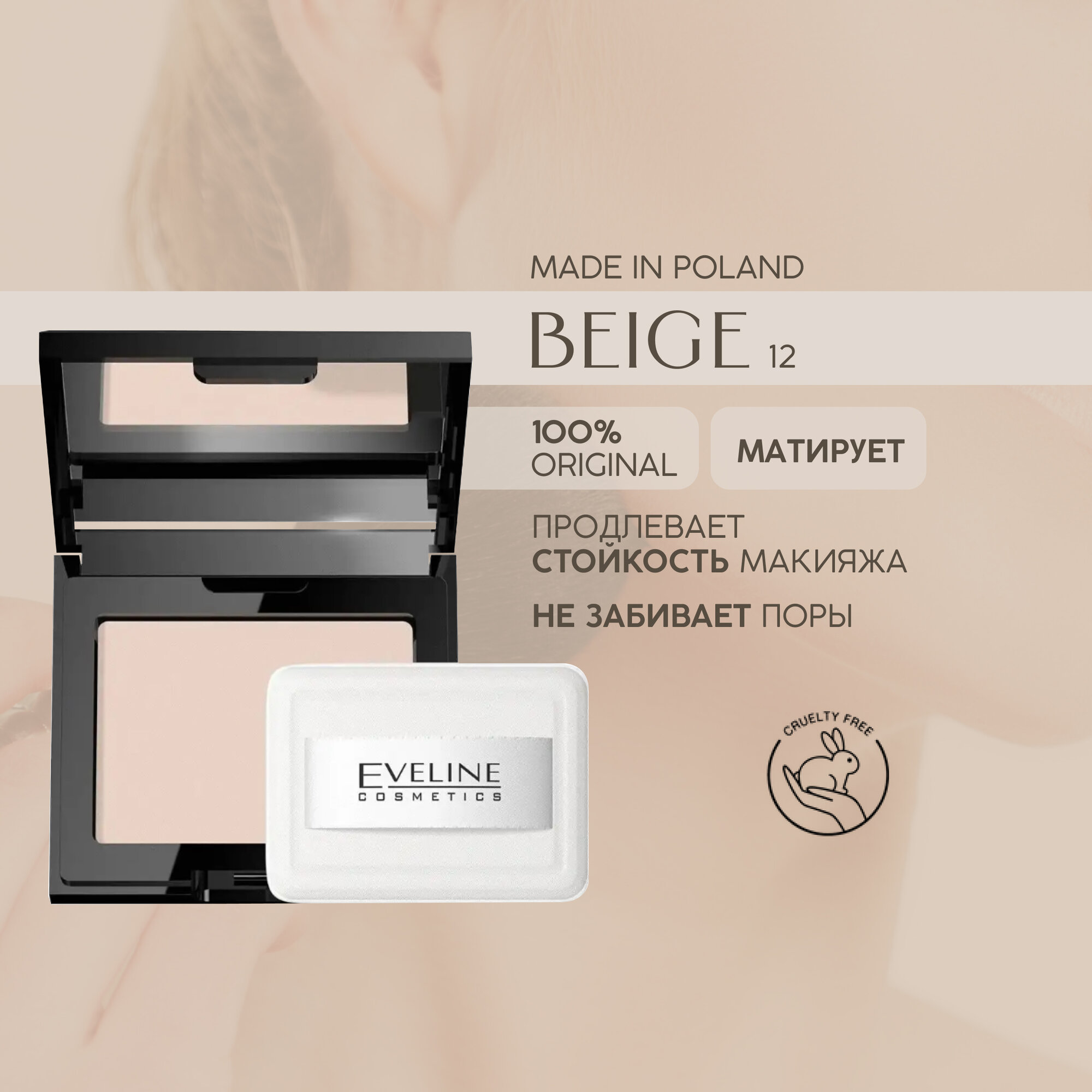 Пудра для лица EVELINE BEAUTY LINE бархатистая компактная №12 BEIGE, 9 гр