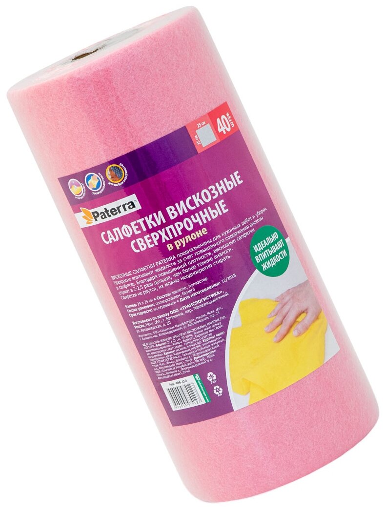 Салфетки вискозные, сверхпрочные, PATERRA, 40 шт. в рулоне, розовый, 25*25 см