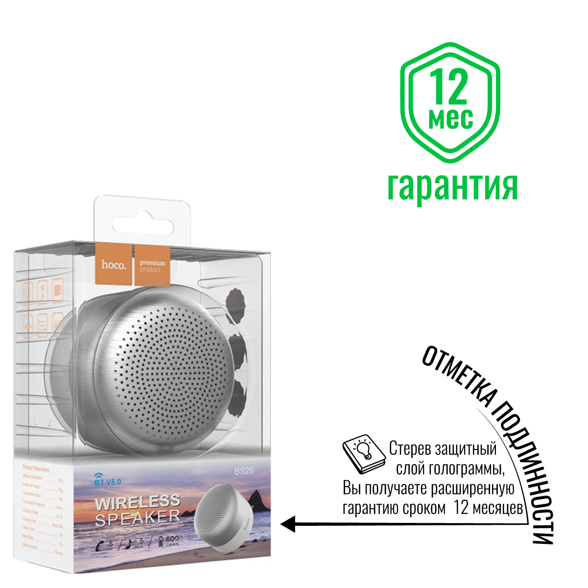 Портативная колонка Hoco BS29 Gamble journey Silver Динамик: 40мм Размер: 747460мм BT V5.0 BK. Поддержка беспроводного воспроизведения, звонков, TF-карт, AUX. Время зарядки: около 2 часов. Звонки / музыка: 5 часов. Батарея: 600mAh, батарея класса А 18650.