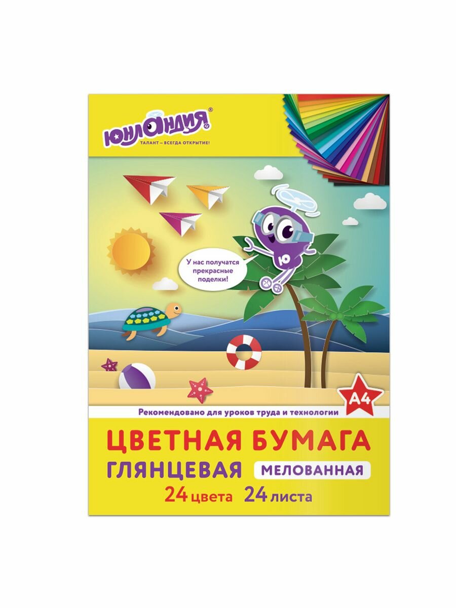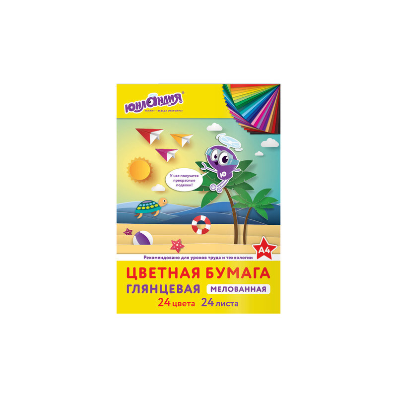 СохранитьЦветная бумага Юнландия А4, мелованная, 24 цвета, скрепка, Юнландик на море (129555) интересное: