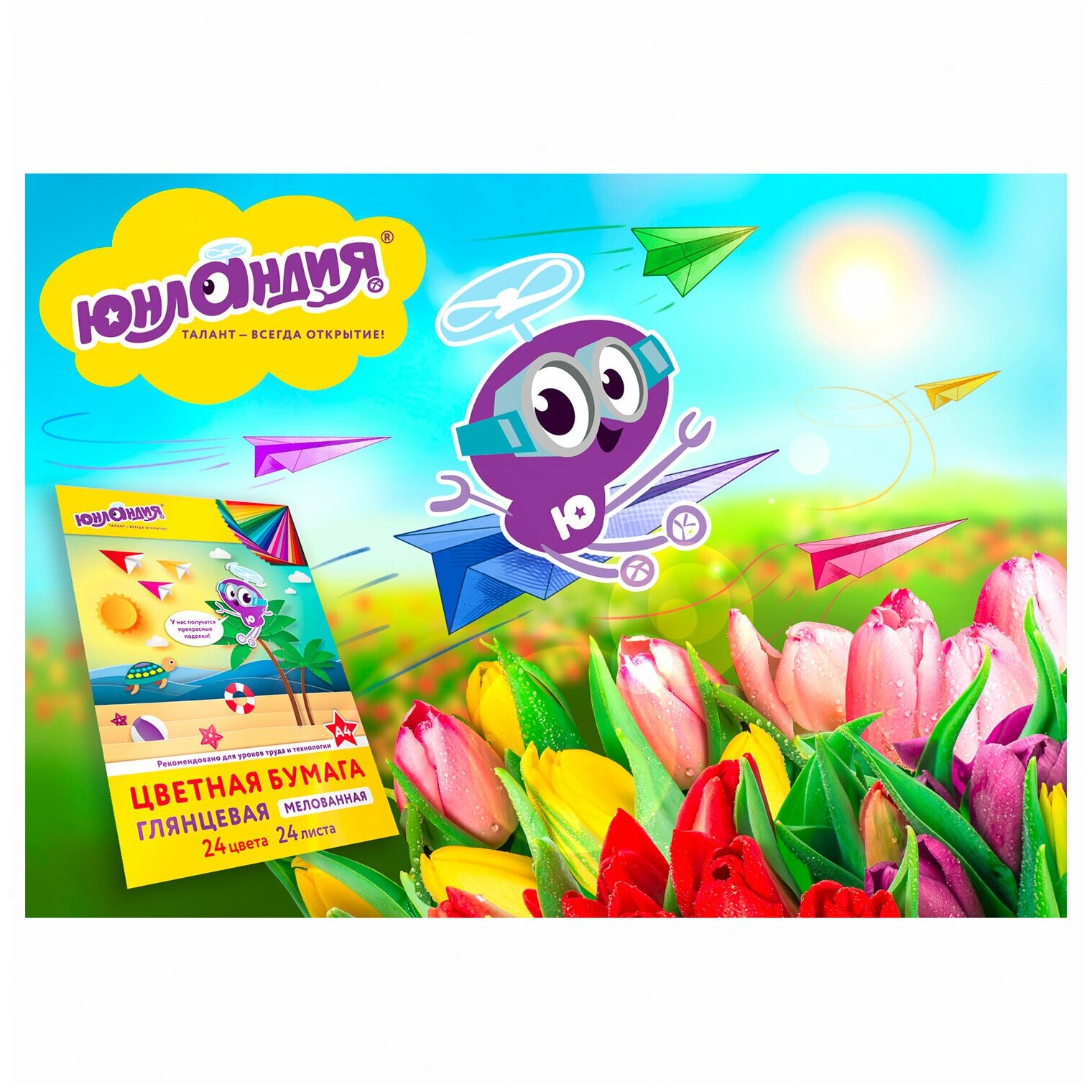 Цветная бумага, А4, мелованная (глянцевая), 24 листа 24 цвета, на скобе, юнландия, 200×280 мм, «юнландик на море», 129555