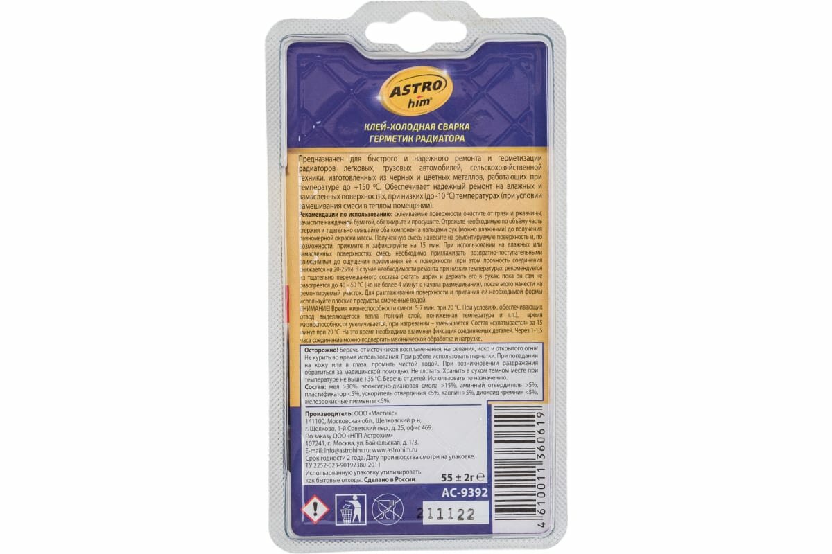 Купить ASTROHIM AC9392 Клей холодная сварка герметик радиатора серия блистер 55г ASTROhim AC9392
