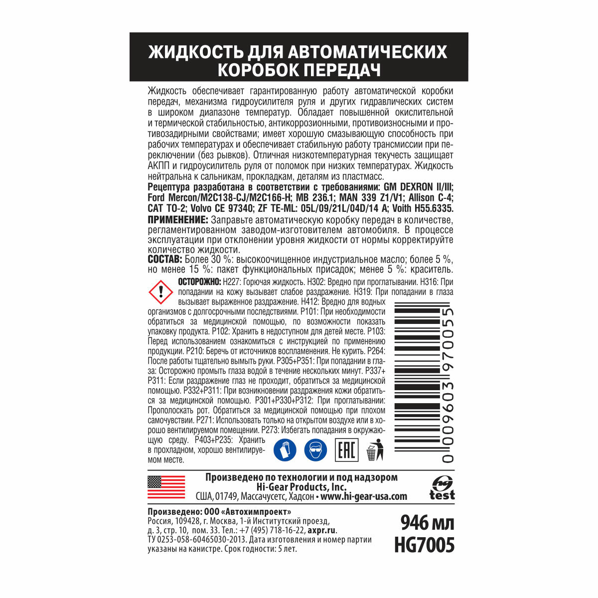 Жидкость Для Акпп 946мл. Hi-Gear Hg7005 В Подольске Hi-Gear арт. HG7005