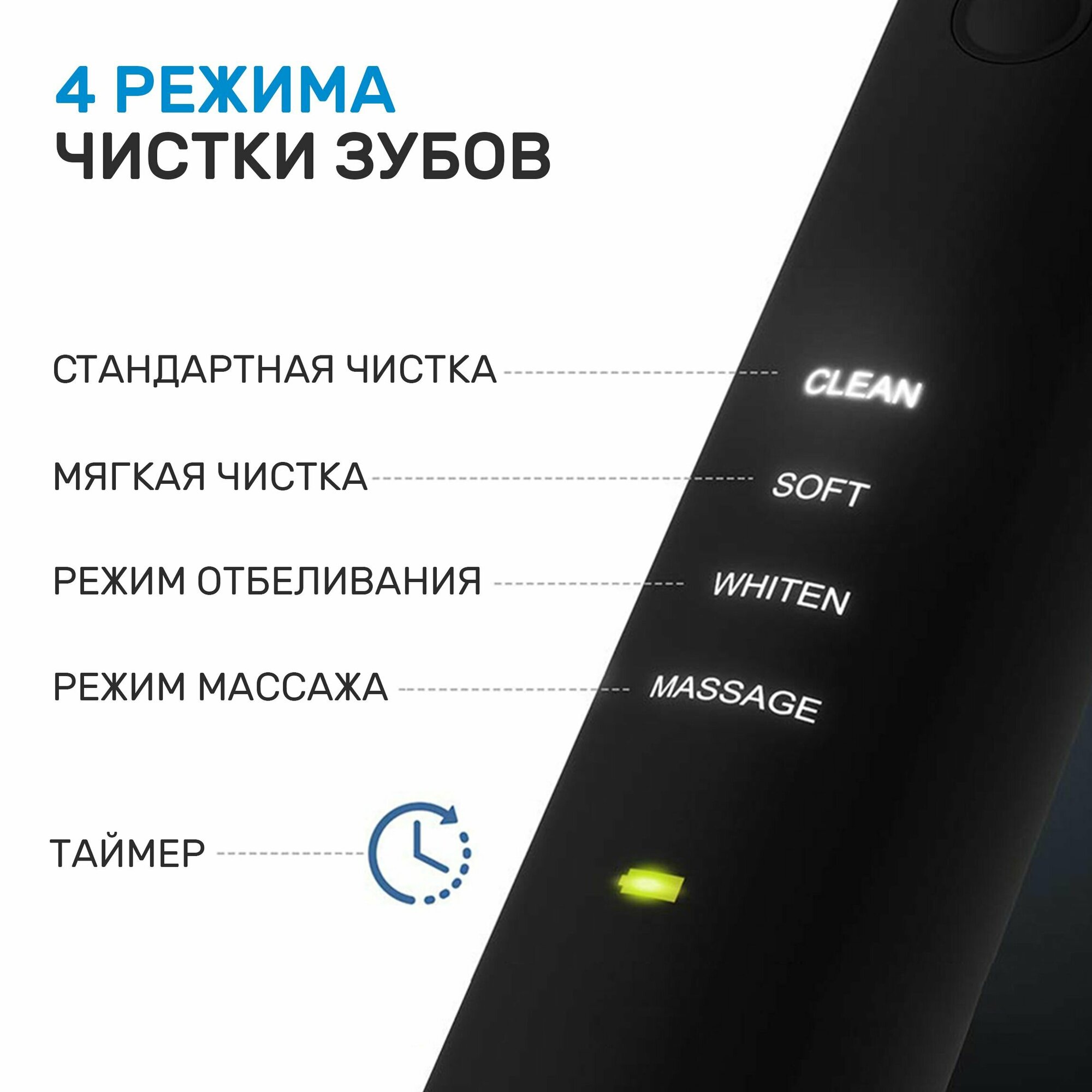 Автоматический таймер на 2 минуты Удобная зарядка + дорожный кейс Запасные насадки Хорошо очищает налет |