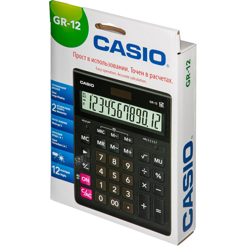 Купить Калькулятор Casio настольный, 12 разрядов, двойное питание, 209х155 мм, черный (GR-12-W-EP)