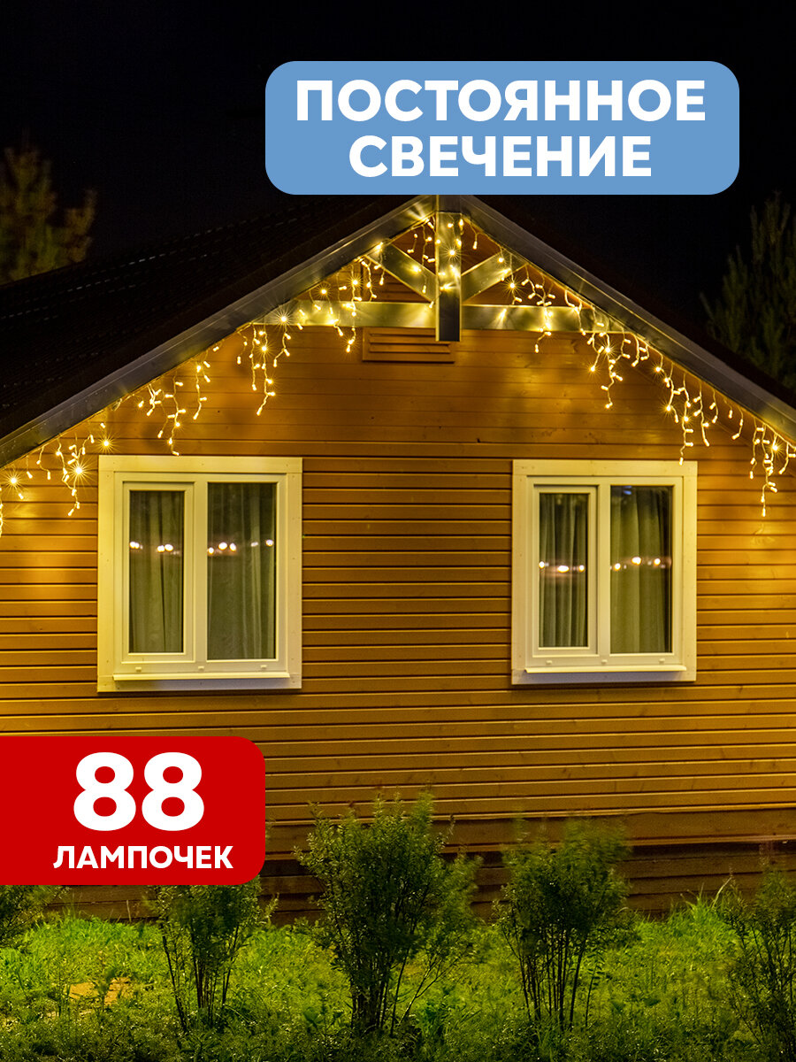 Гирлянда Айсикл (бахрома) светодиодный, 2,4 х 0,6 м, белый провод, 230 В, диоды Теплый Белый, 88 LED .