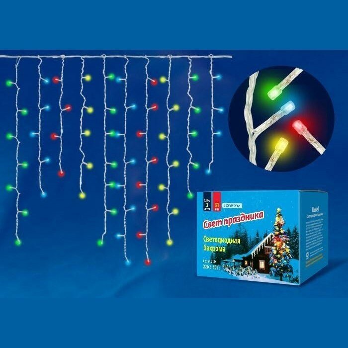 Гирлянда Uniel Бахрома UL-00002270, 0.7 х 0.7 м, 200 ламп, разноцветный/прозрачный провод