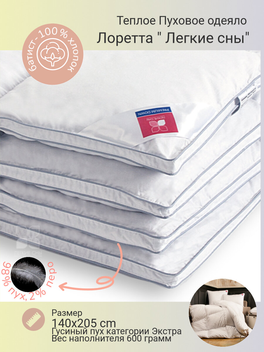 Теплое пуховое одеяло 140х205 / натуральный пух экстра / Ткань: Сатин / Лоретта / Легкие Сны /1ед.