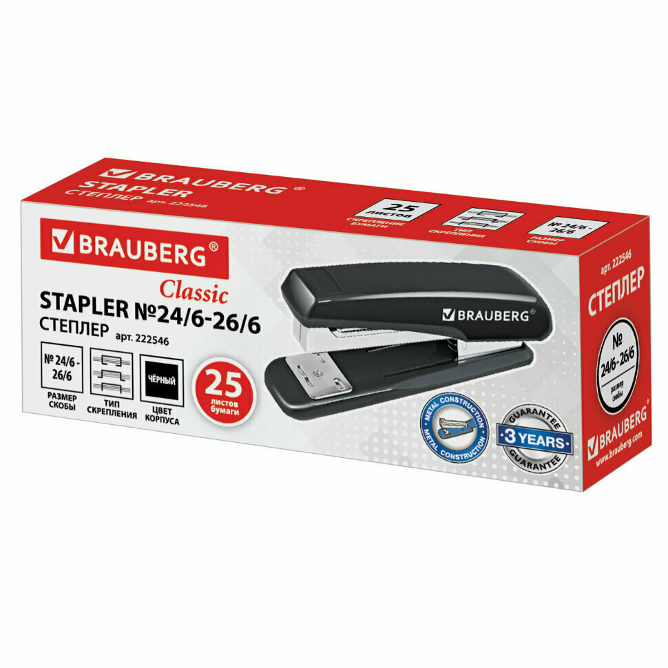 Степлер №24/6, 26/6 BRAUBERG "Classic", до 25 листов, черный, 222546, 222546