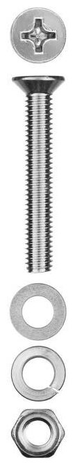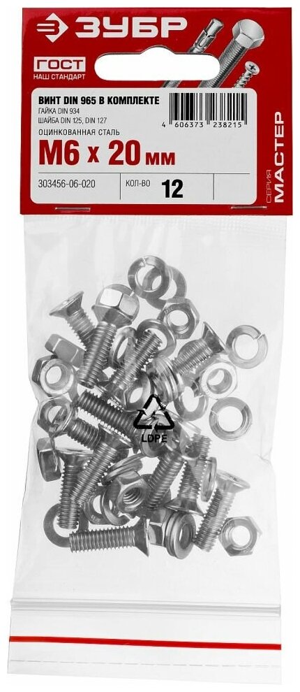 Винт ЗУБР (DIN965) в комплекте с гайкой (DIN934), шайбой (DIN125), шайбой пруж. (DIN127), M6 x 20 мм, 12 шт 303456-06-020