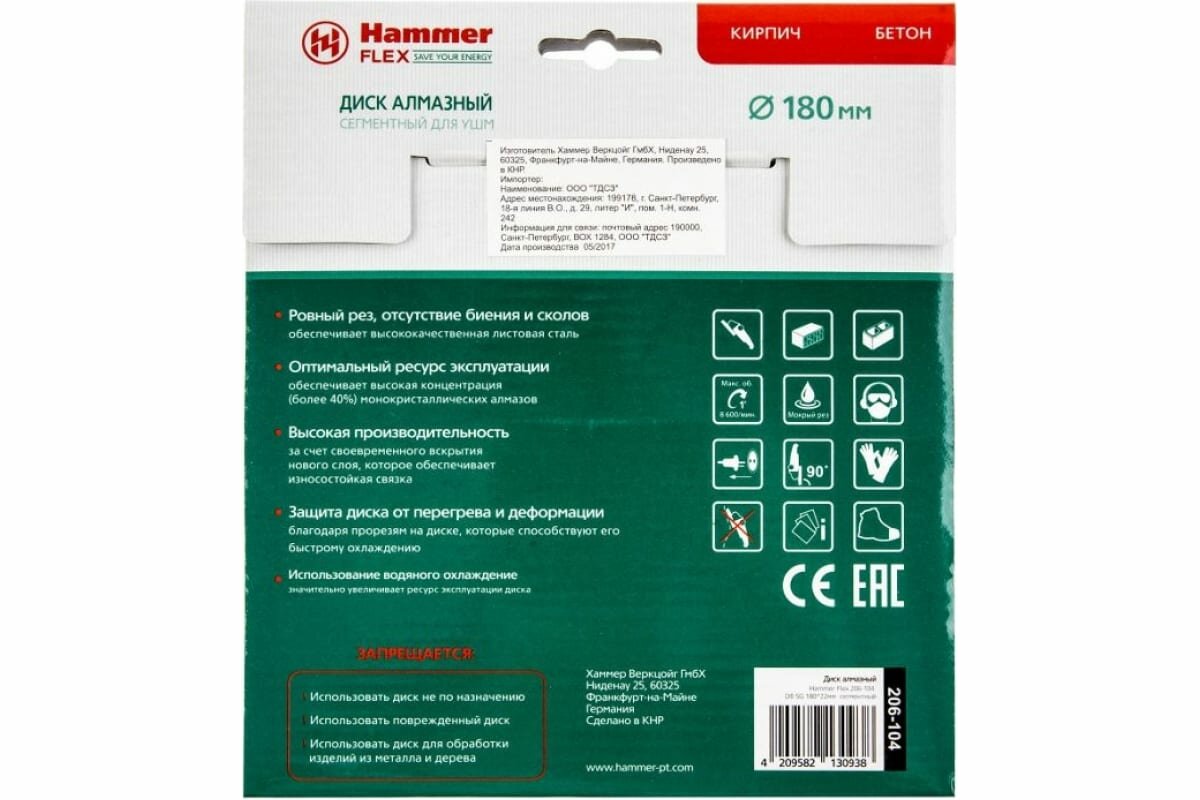 Ниже Вы можете прочитать отзывы на Диск алмазный Hammer Flex 206-104 DB SG 180х22 мм, сегментный, универсальный, ознакомится с подробными характеристиками, посмотреть интересные обзоры и фотографии на Диск алмазный Hammer Flex 206-104 DB SG 180х22 мм, сегментный, универсальный.