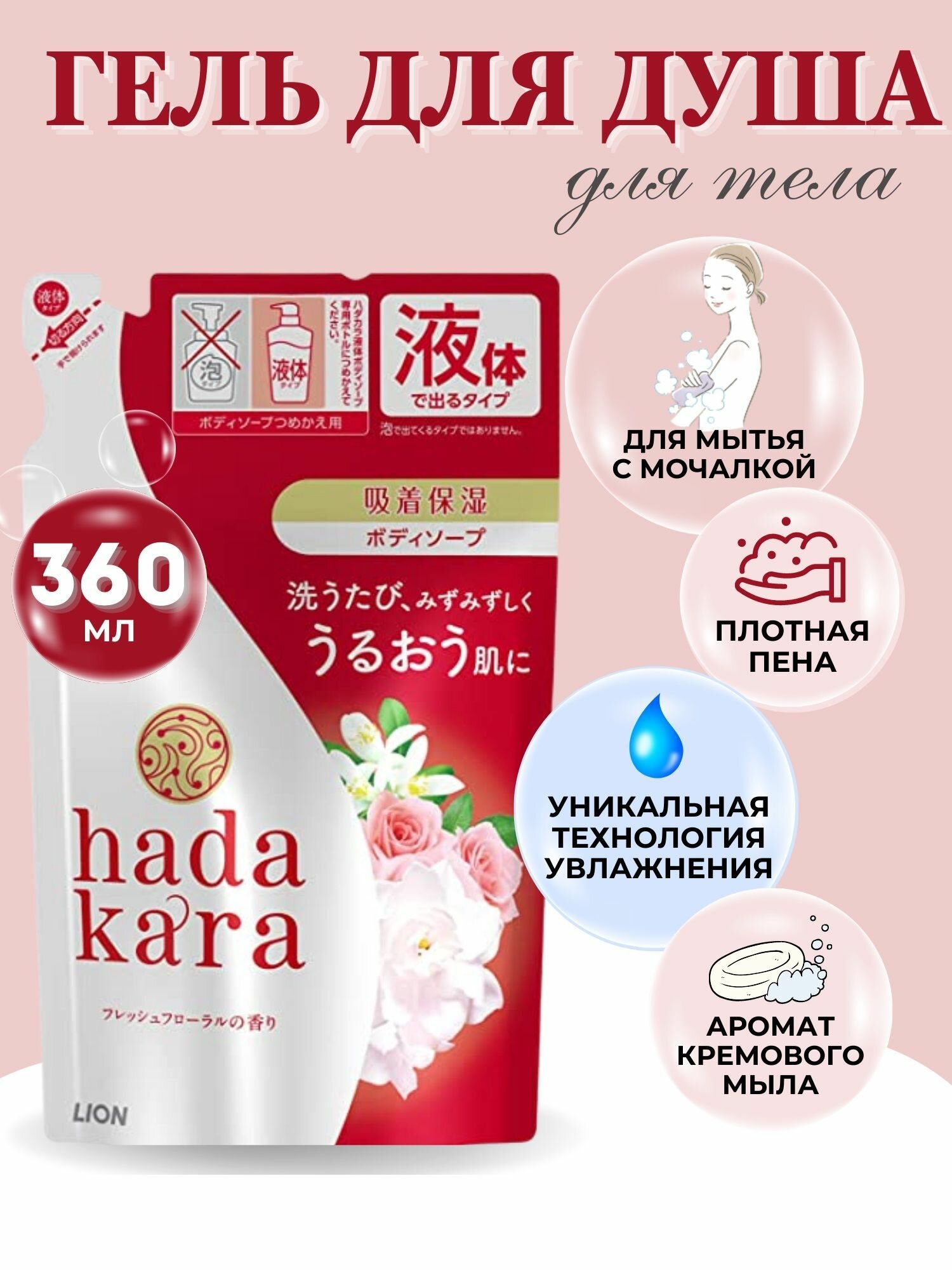 Увлажняющее жидкое мыло Lion Hadakara для тела с ароматом изысканного цветочного букета, мягкая упаковка, 360 мл
