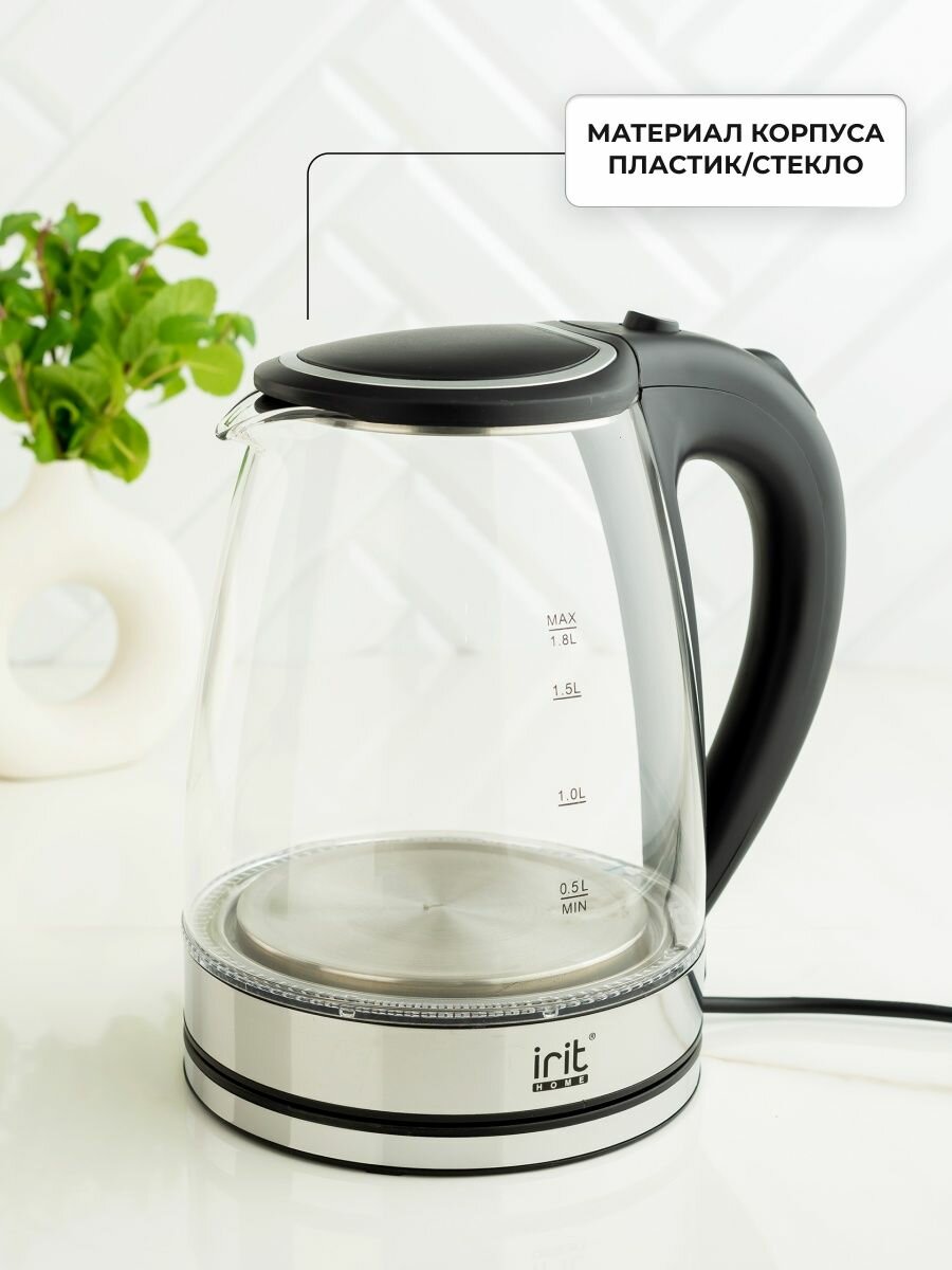 Чайник электрический Irit IR-1236, стекло, 1.8 л, 1500 Вт, подсветка, серебристый
