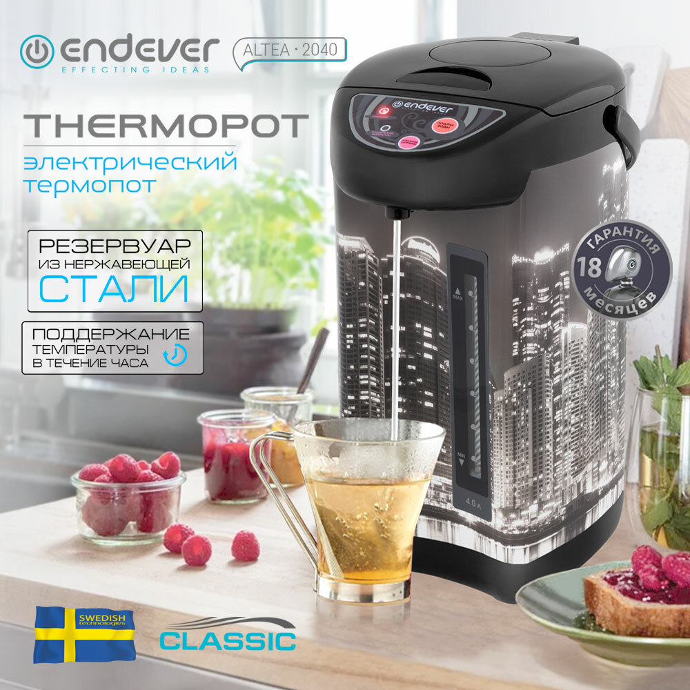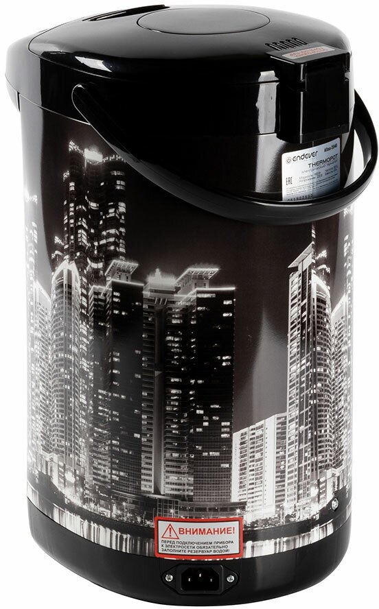 Стильный термопот с принтом «Ночной город» Endever Altea-2040 покупался нами для пользования в офисе. Отлично дополняет интерьер. Он рассчитан на 4 литра. Сам из пластика, а колба из металла. Стенки двойные, поэтому термопот безопасен. К нему можно прикасаться, не боясь обжечься. Для безопасности есть еще блокировка крышки и блокировка включения без воды. Насос может как автоматически, так и вручную. Есть терморегулятор и возможность поддержания температуры. Крышка съемная. Это сделано для удобства долива воды. Как хорошо, что можно в любой момент сделать себе кофе или чай, да или просто выпить теплой воды.