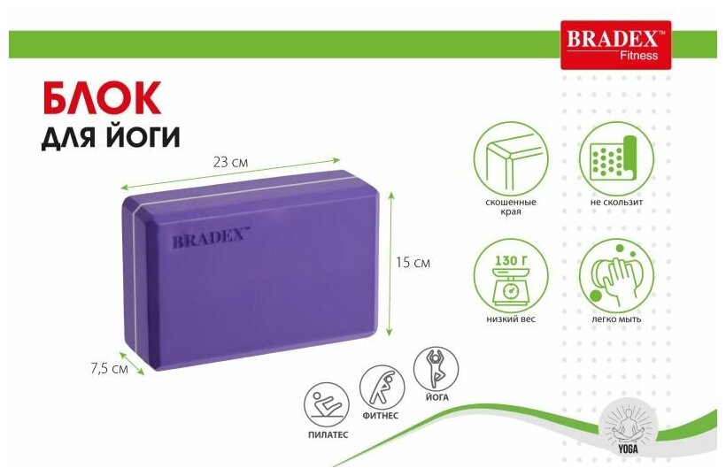 Блок для йоги BRADEX, кирпич для фитнеса и гимнастики, опорный кубик для растяжки, 23х15х7,5 см, фиолетовый