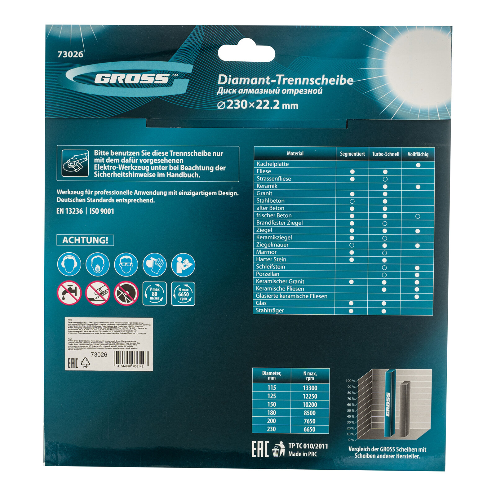 Диск алмазный Gross ф230х22,2мм, турбо-сегментный, сухое резание 73026