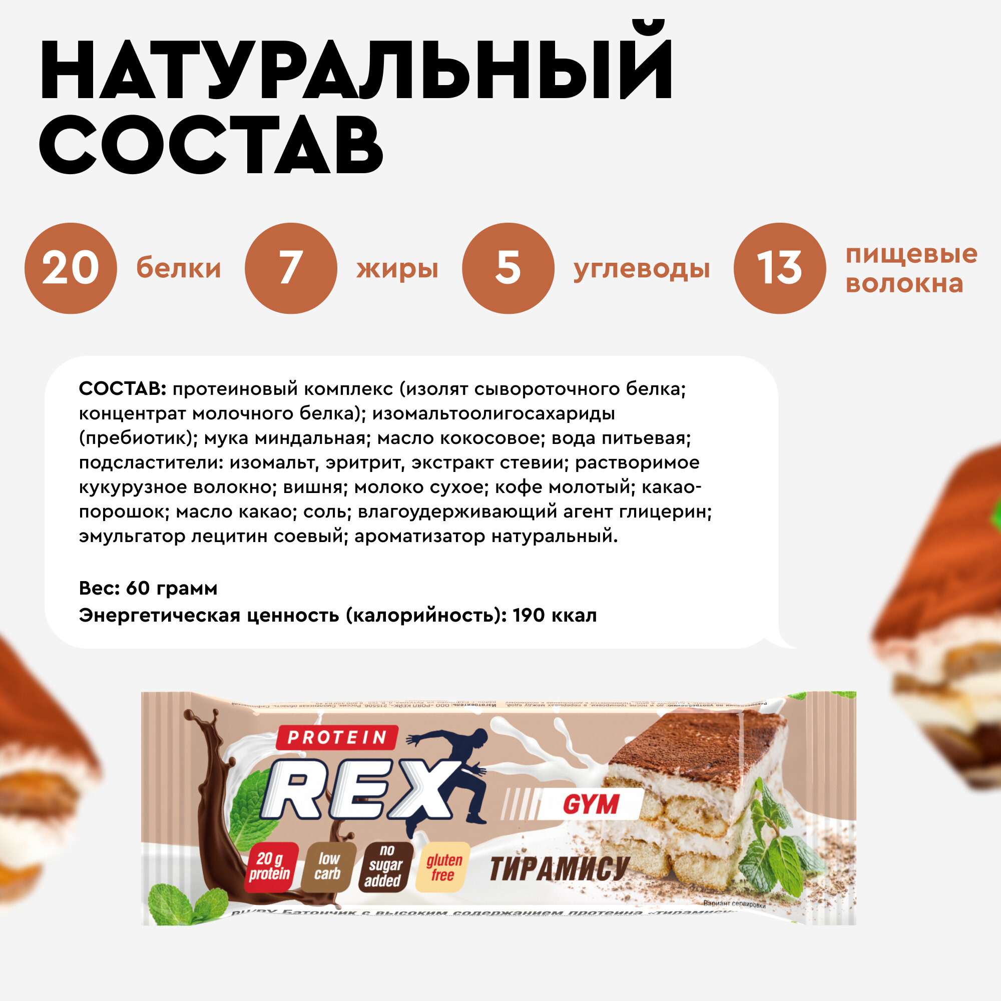 Протеиновые батончики ProteinRex GYM Тирамису 15 шт х 60 г без сахара, десерт, спортивное питание, ПП еда, спортивные батончики