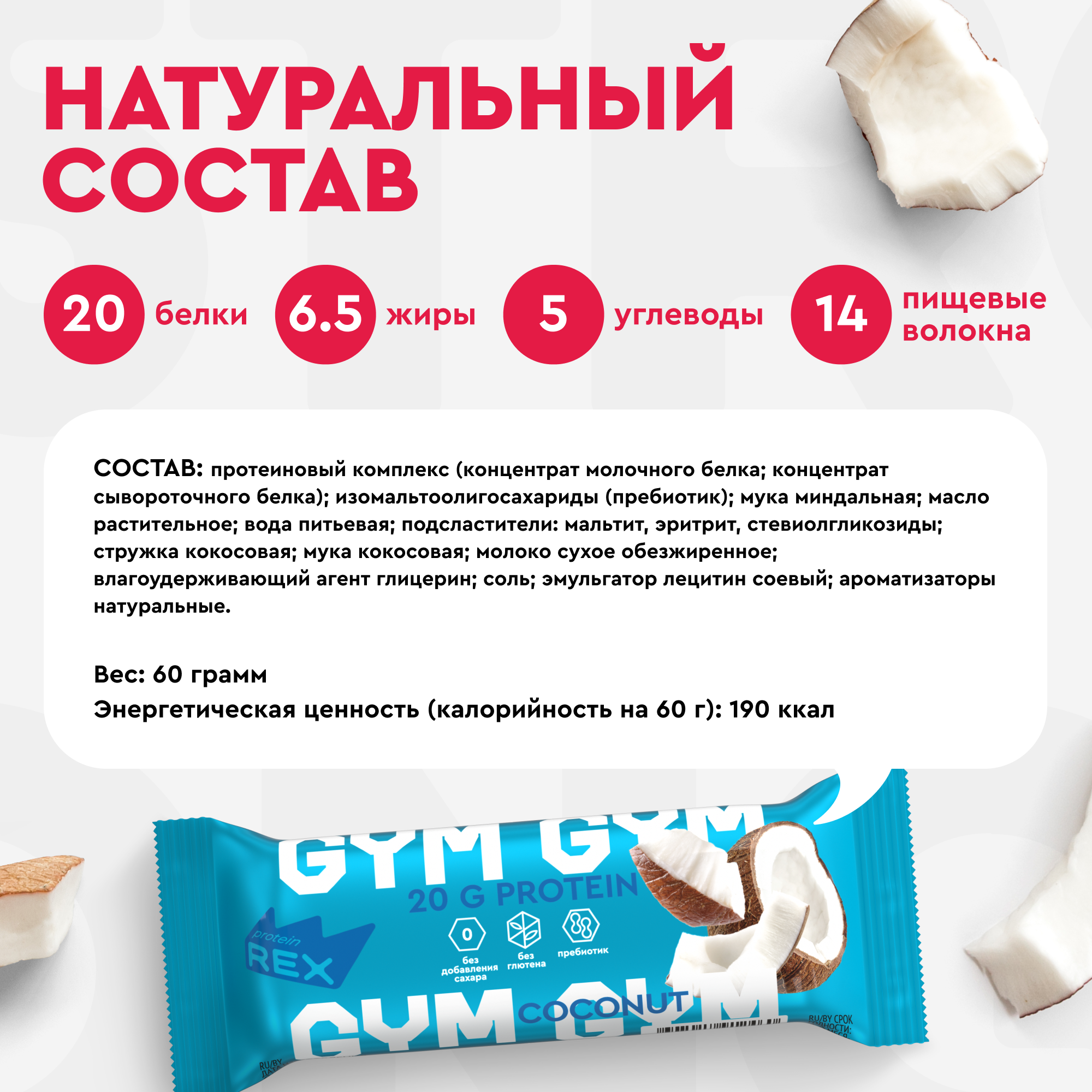 Протеиновые батончики без сахара ProteinRex GYM (Джим) кокос, 15 шт х 60 г, 190 ккал спортивное питание, ПП еда, спортивные батончики