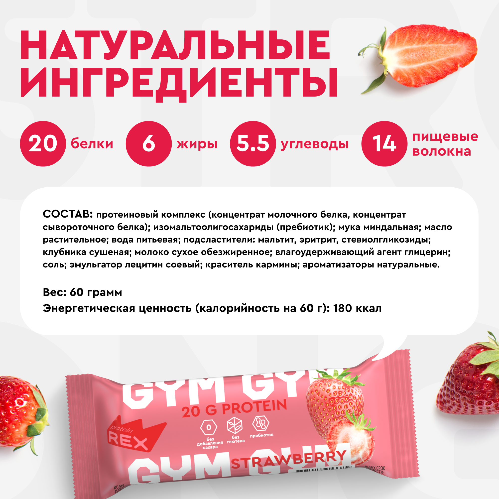 Протеиновые батончики без сахара ProteinRex GYM (Джим) клубничный десерт, 15 шт х 60 г, 180 ккал спортивное питание, ПП еда, спортивные батончики