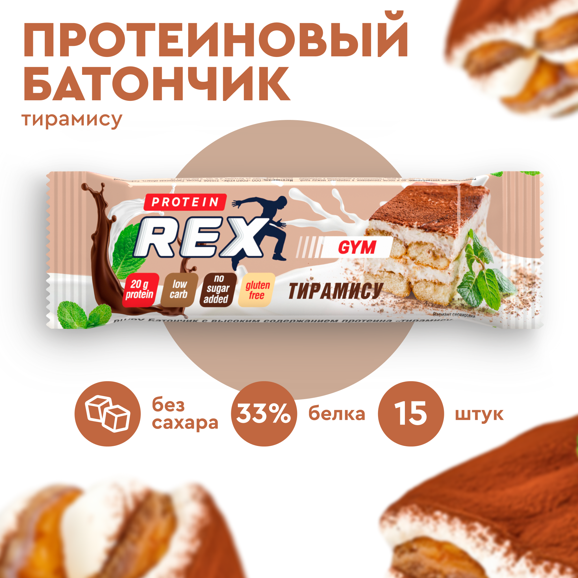 Протеиновые батончики без сахара ProteinRex GYM (Джим) тирамису, 15 шт х 60 г, 190 ккал спортивное питание, ПП еда, спортивные батончики