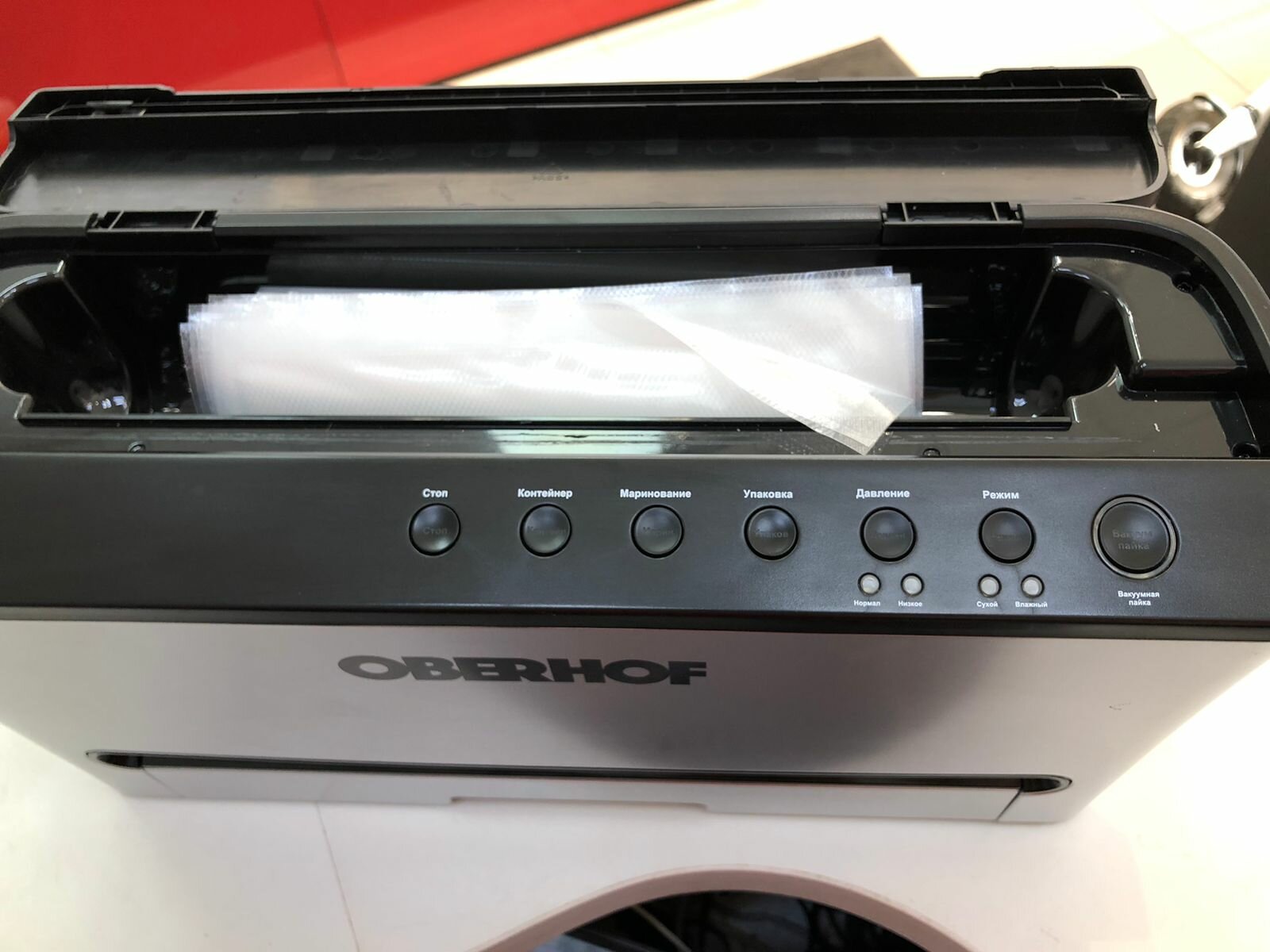| Минусы: | Завышенная цена. Качество и внешний вид полностью не соответствуют цене. При цене на момент покупки в 165 $ из-за тонкого и гулкого пластика выглядит и в руках ощущается как самый дешовый струйный принтер за 50 $. Шнур сетевой как короткий, так и низкого качества. Качество материала играет плохую роль и в том, как агрегат собственно и работает. За что продавцом назначена цена вдвое выше аналогичных аппаратов для меня так и осталось загадкой. Сказать что я переплатил за бренд - так услышал про Оберхоф впервые в жизни. Знакомым придётся говорить, что купил за 5 тысяч рублей, чтобы не выглядеть дураком. Видимо маркетинг рассчитан не на популярность модели за счёт качества и соответствующих хороших отзывов, а на высокую цену и "авось хоть кто-то да купит". Из-за тонкого пластика опускаемая панель с верхними уплотнителями не имеет продольной жёсткости и нельзя прихватить край пакета если одной рукой опустить только один из боковых рычагов - панель перекашивает и очень сильно. На фото со снятым нижним лотком это хорошо видно. Опускать нужно сразу оба рычага, т.е. двумя руками. Соответственно третьей руки у людей нет и держать пакет в этот момент не получится, он будет лежать на столе. Из-за этого возможно выскальзывание пакета из камеры вакуумирования, неровная пайка, нельзя запаять короткий край пакета, т.е. будет перерасход рулона на 5-7 см с каждого пакета. Текст на кнопках и над ними очень мелкий, я с хорошим зрением, но текст могу прочитать с трудом. Текст под лампочками, указывающими на режим работы, вообще можно читать только с увеличительным стеклом. На фото для сравнения размещена спичка. Вдоль щели для рулона нанесена шкала, но на ней не отмечен центр и нет нумерации делений. Соответственно зачем она? Ни отмерить ни отцентровать она не помогает. В комплекте нет сменных уплотнителей, уплотнители несъёмные, т.е. при повреждении только в ремонт. |
