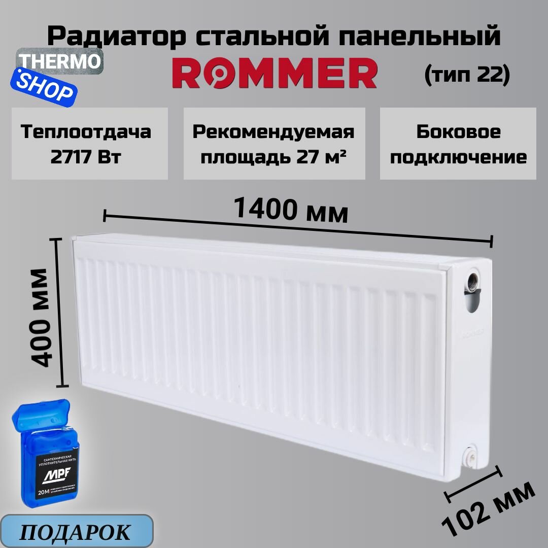 Радиатор стальной панельный ROMMER 400х1600 боковое подключение Compact 22/400/1600 Нить сантехническая
