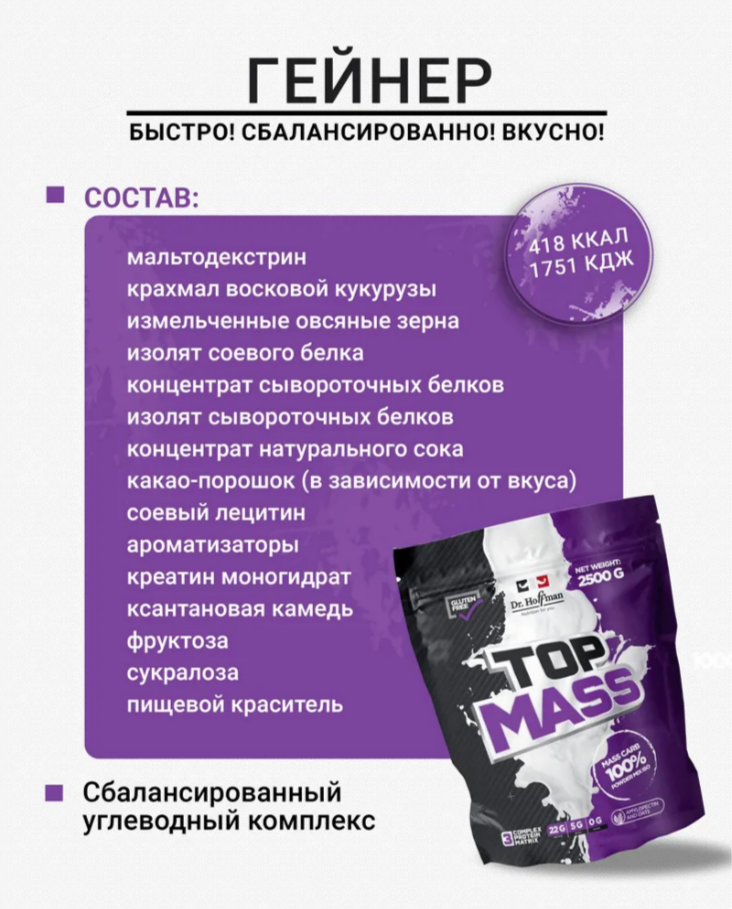 Dr.Hoffman Top Mass 2500g (Шоколад), Гейнер для набора массы, для роста мышц, Высокобелковый гейнер, 2500 грамм