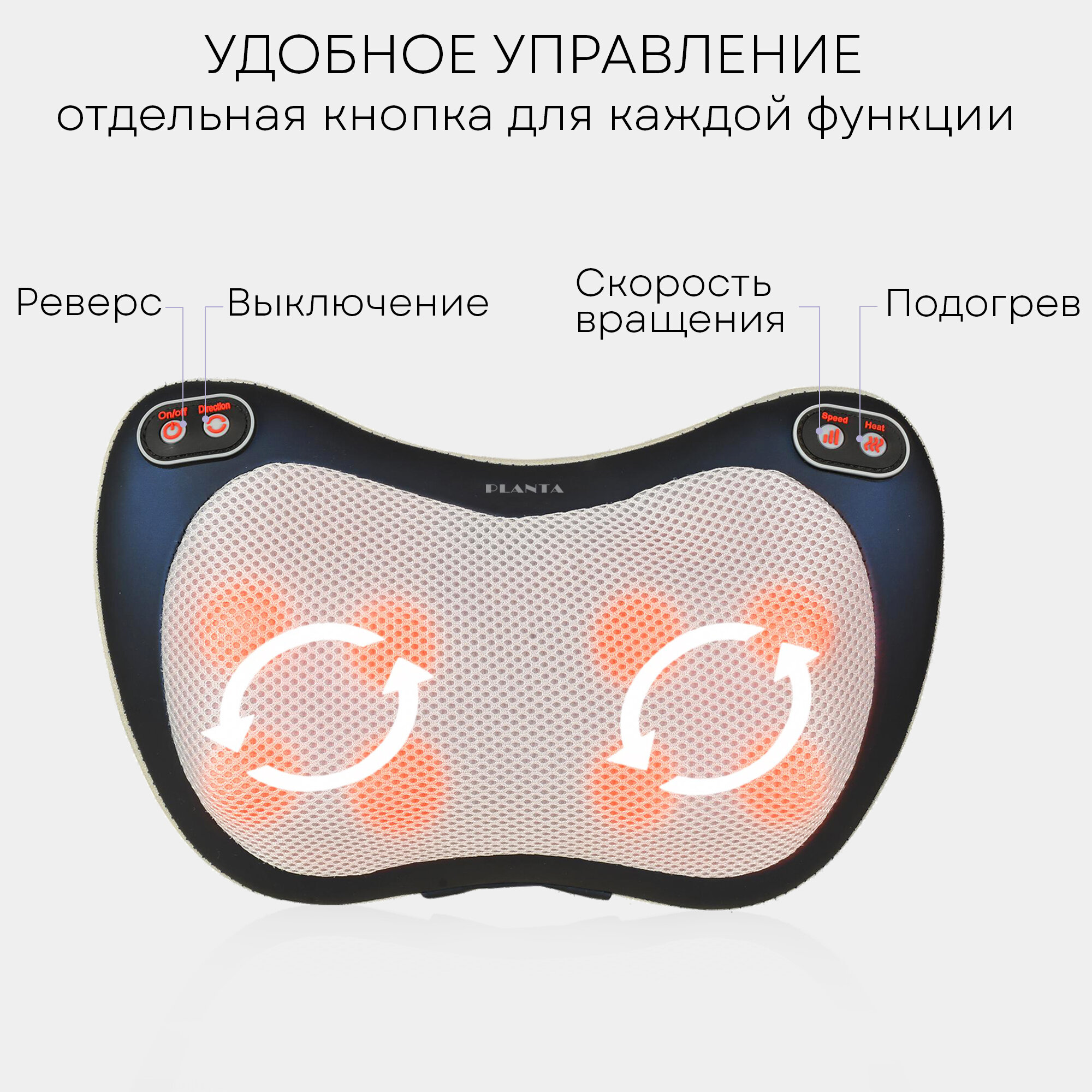 PLANTA Массажная подушка для дома и автомобиля MP-015, разминающий массаж Шиацу, 4 функции, реверс роликов, подогрев, таймер и автоотключение, съемный чехол
