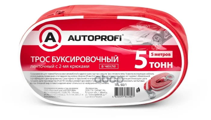 AUTOPROFI TRL-50/1 трос буксировочный ленточный, с крюками, 5т, 5м, сумка\
