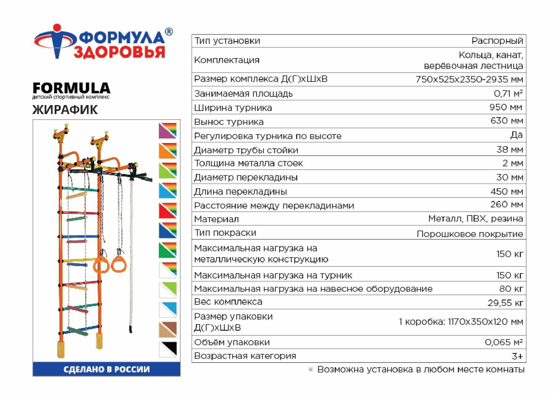 Детский Спортивный Комплекс Распорный шведские стенки Формула здоровья Жирафик green/rainbow