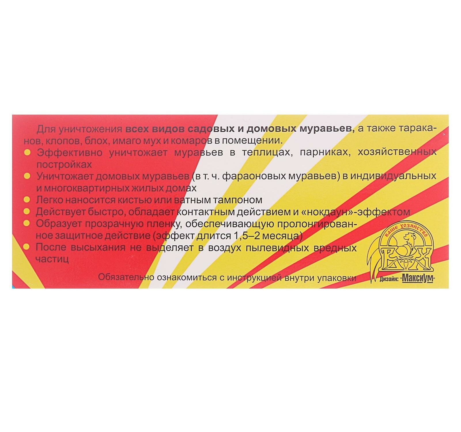 | Плюсы: | Вредит только муравьям, не издает запахов и вредных паров. |