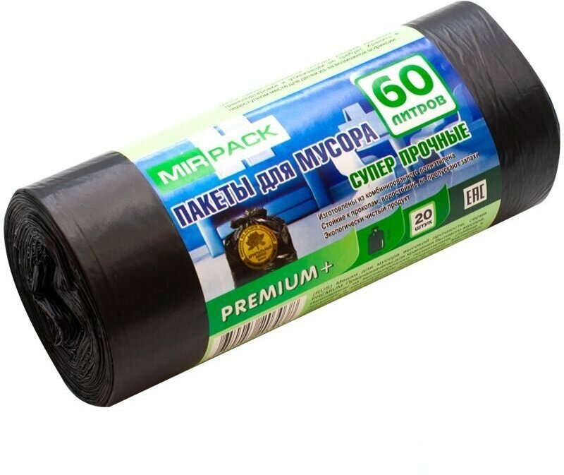 Пакеты для мусора 60л, Mirpack "Premium+" (60x70см, 20мкм, черные) ПСД, 30шт. в рулоне (6030150)