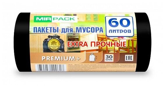 Мешки для мусора MIRPACK PREMIUM+ Extra прочные 60 л, 30 шт., черный