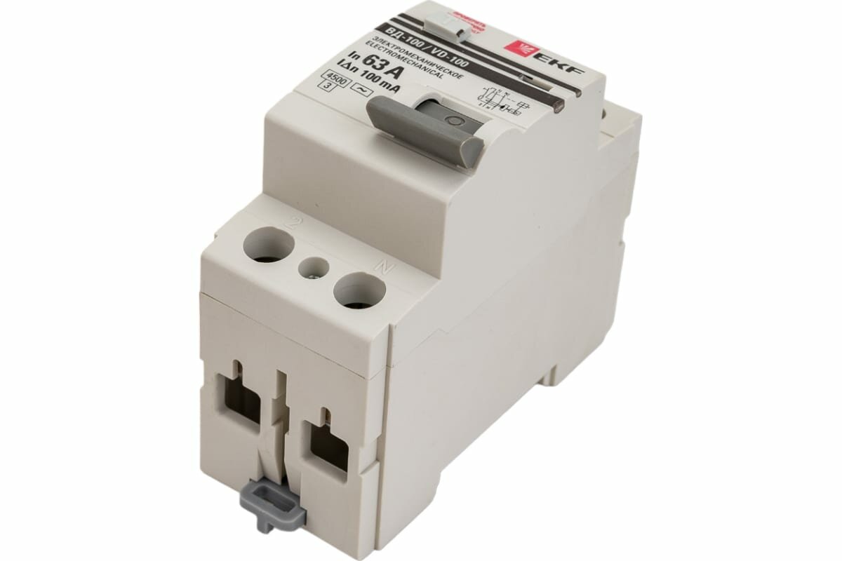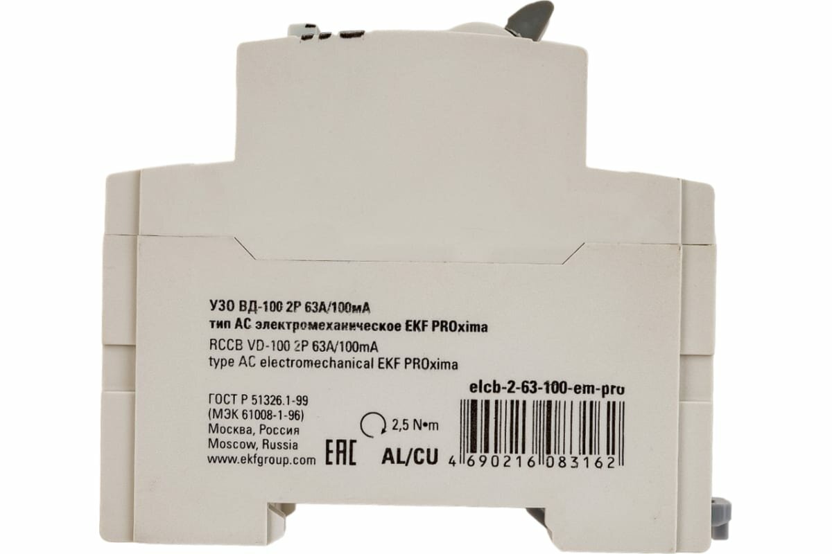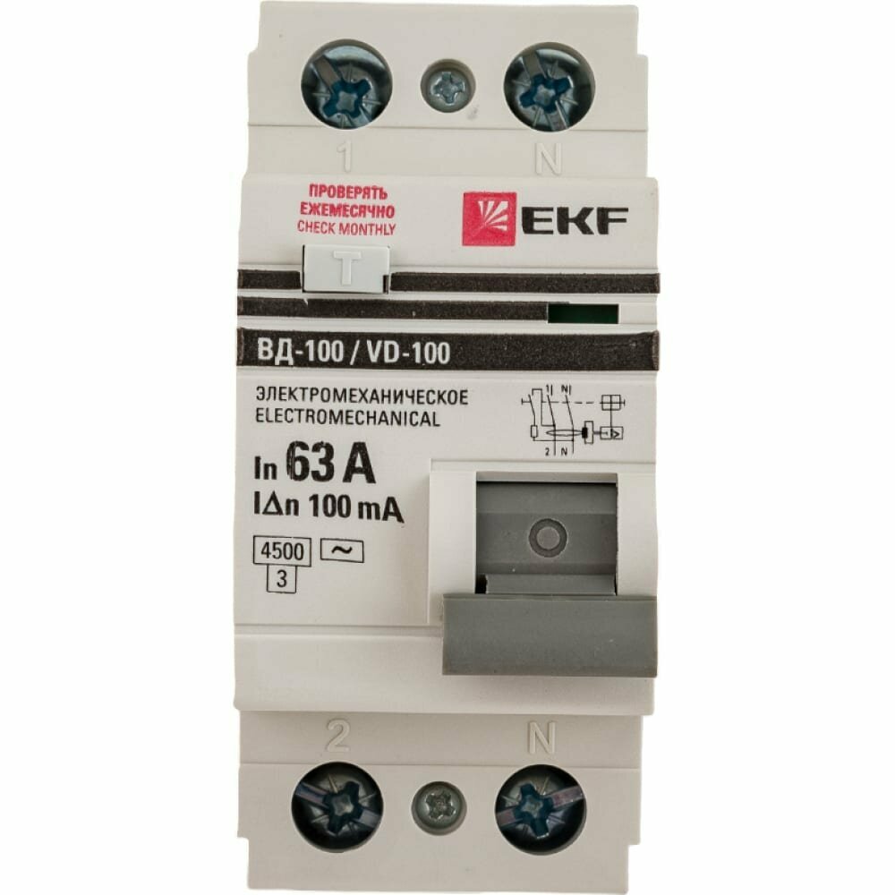Выключатель дифференциального тока (УЗО) 2п 63А 100мА тип AC ВД-100 (электромех.) PROxima, EKF ELCB-2-63-100-EM-PRO (1 шт.)