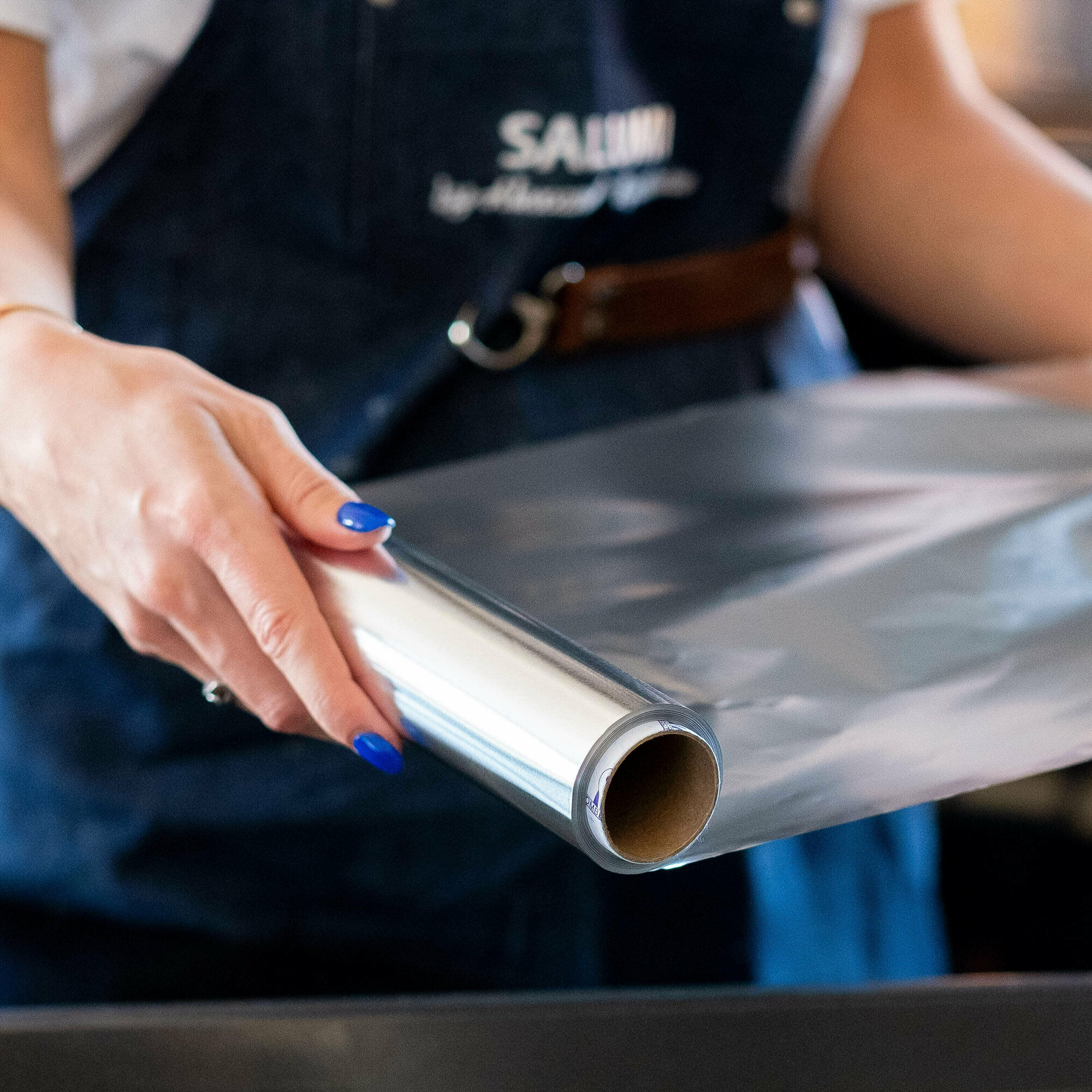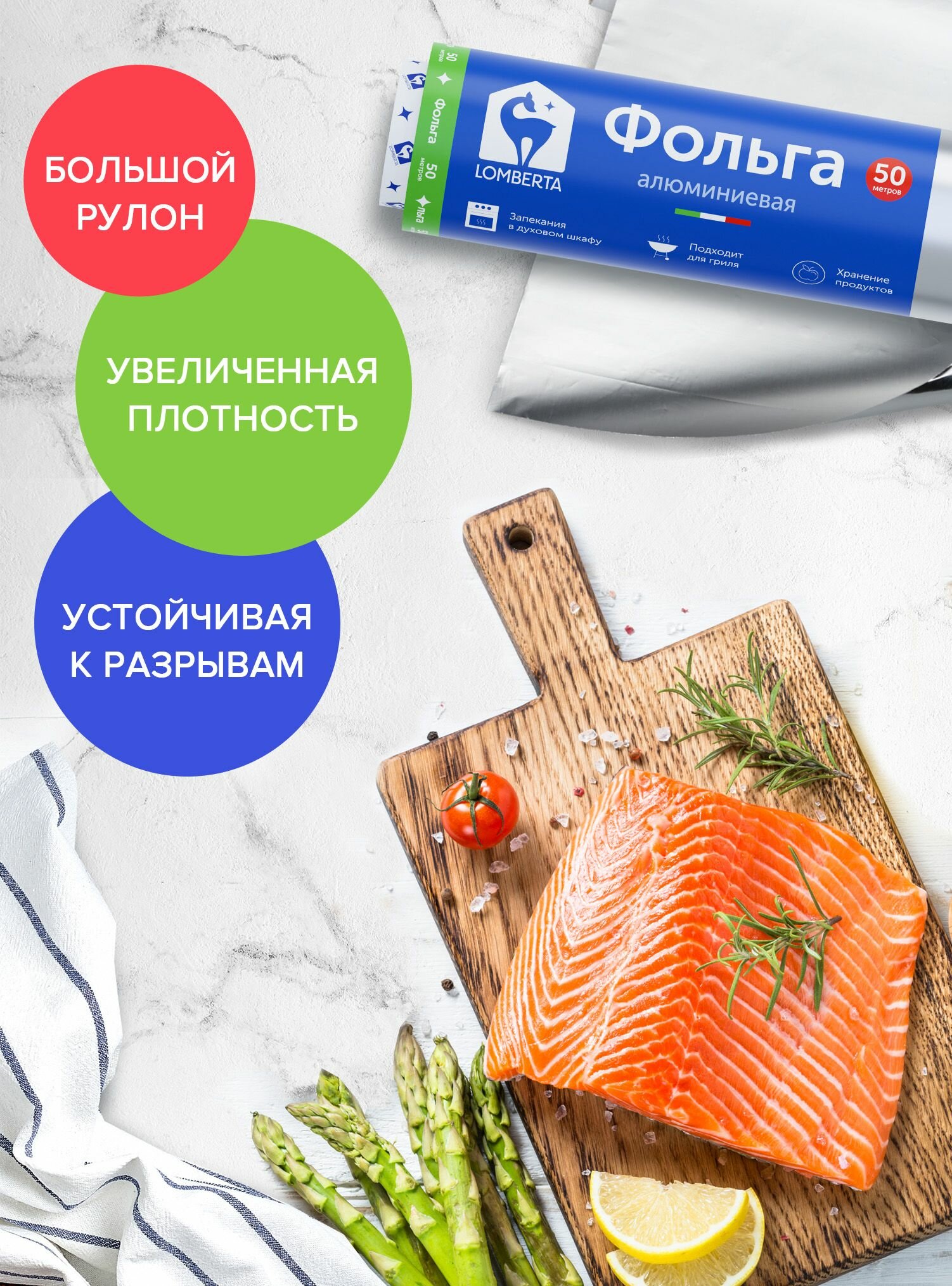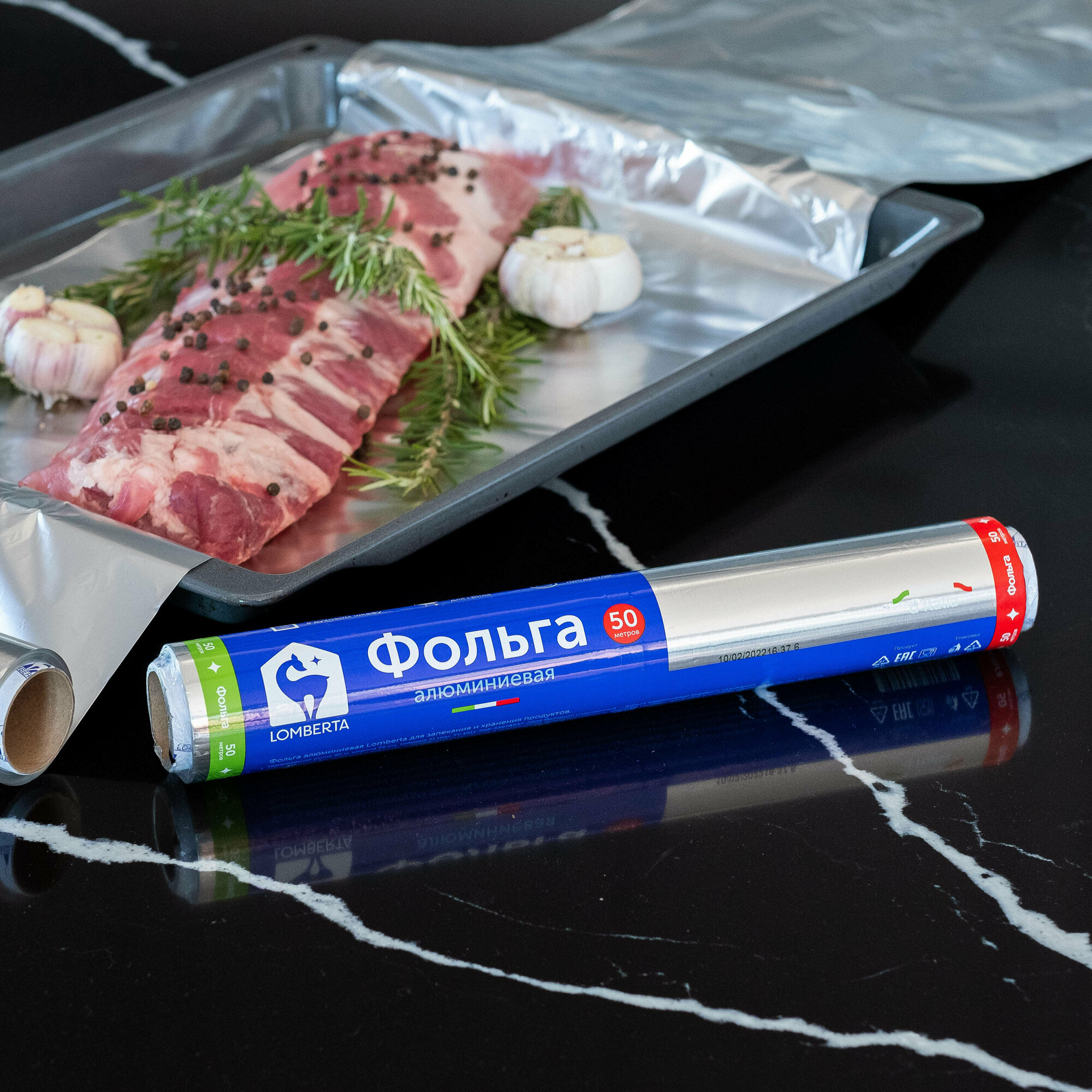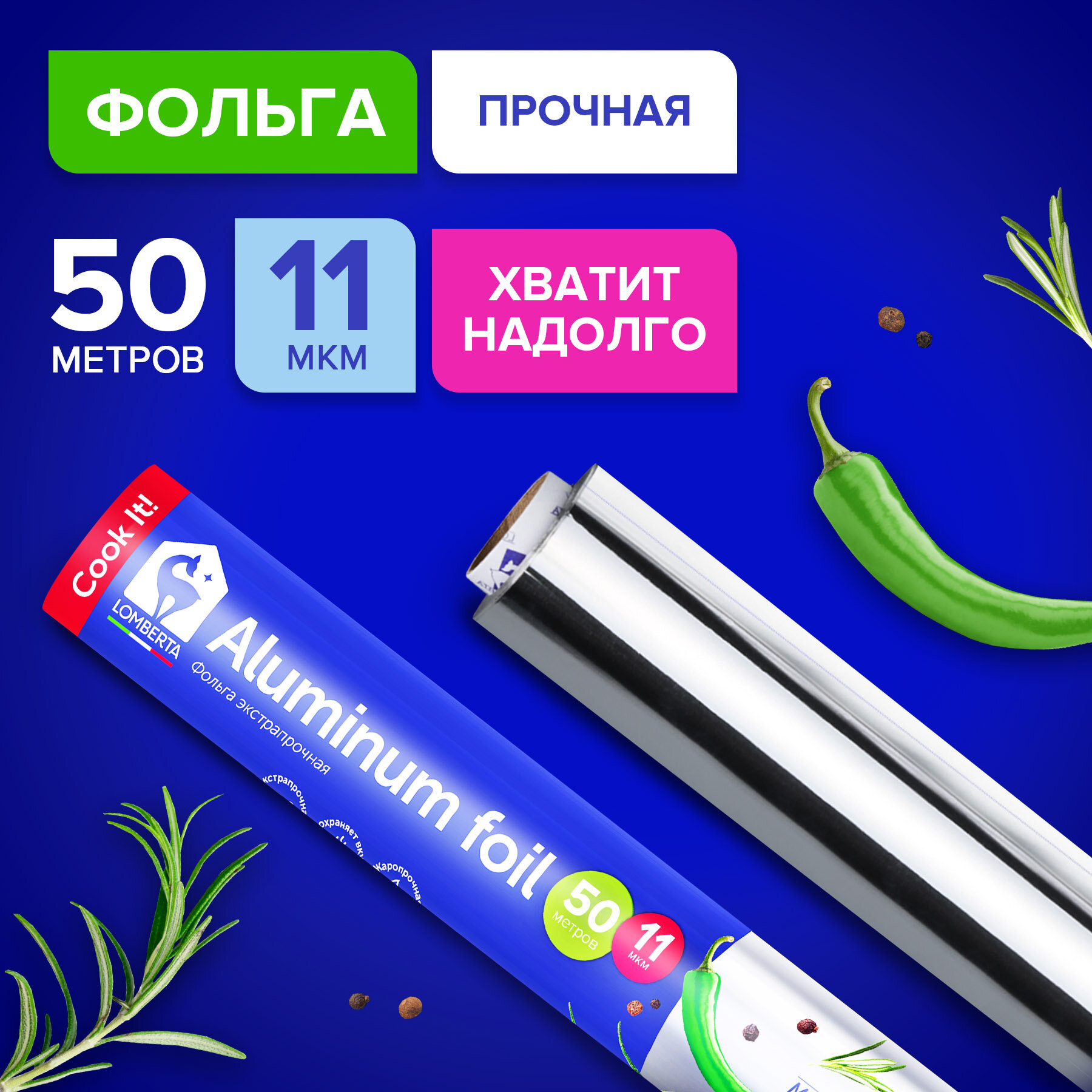 Фольга пищевая Lomberta прочная 11 мкм, алюминиевая в рулоне 50 метров для запекания, выпечки, гриля, хранения еды и окрашивания волос, профессиональная