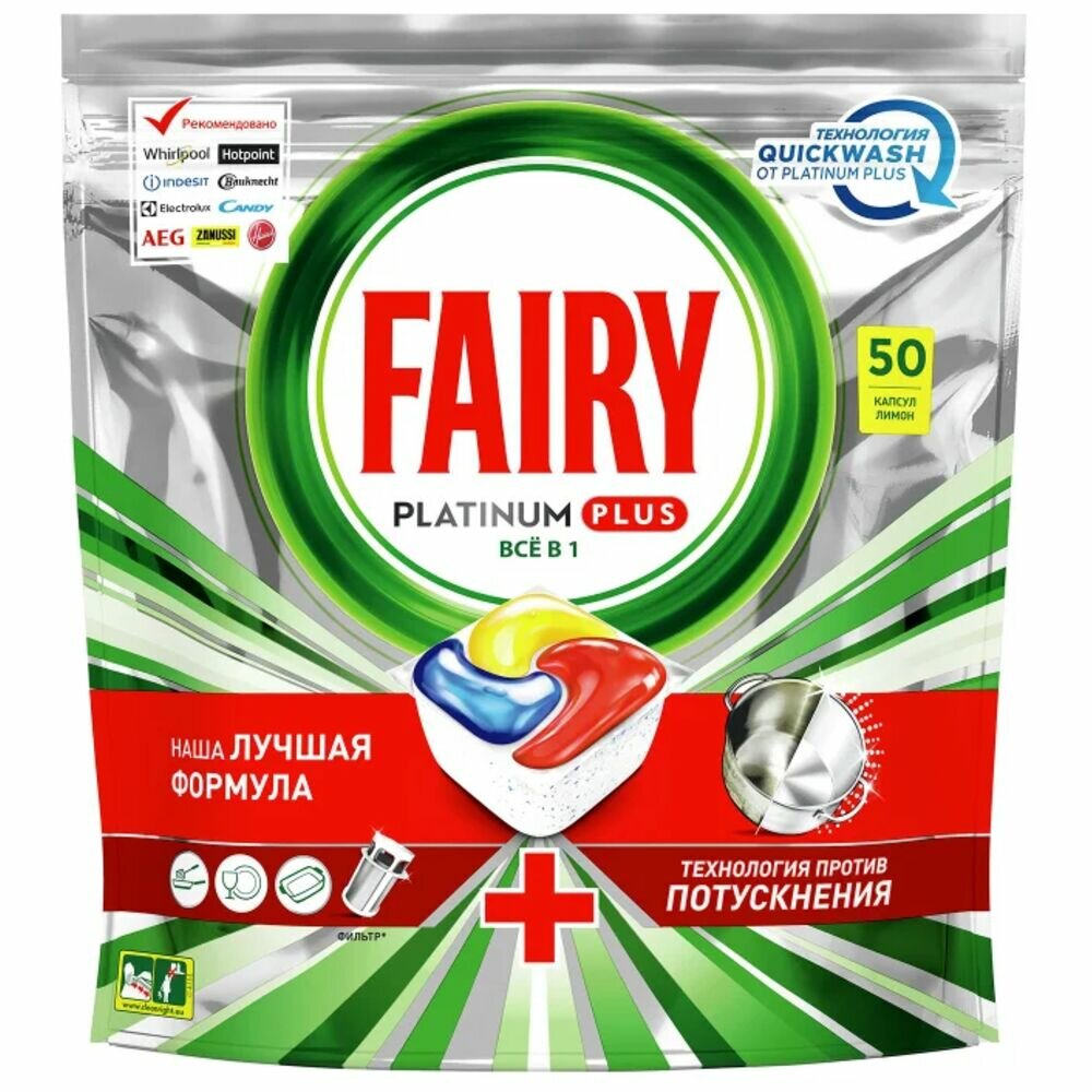 Капсулы для посудомоечной машины Fairy Platinum+ Все-в-Одном капсулы Лимон, 50 шт., пакет