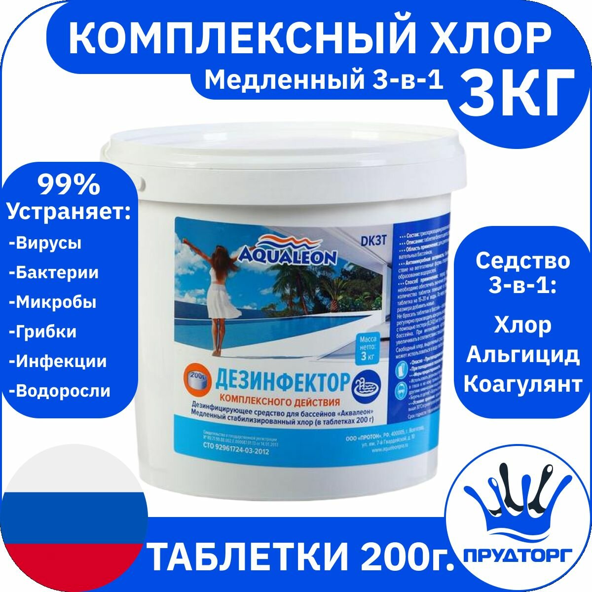 Медленный хлор для бассейна (МСХ КД) Aqualeon комплексный таблетки по 200 гр., 0,6 кг
