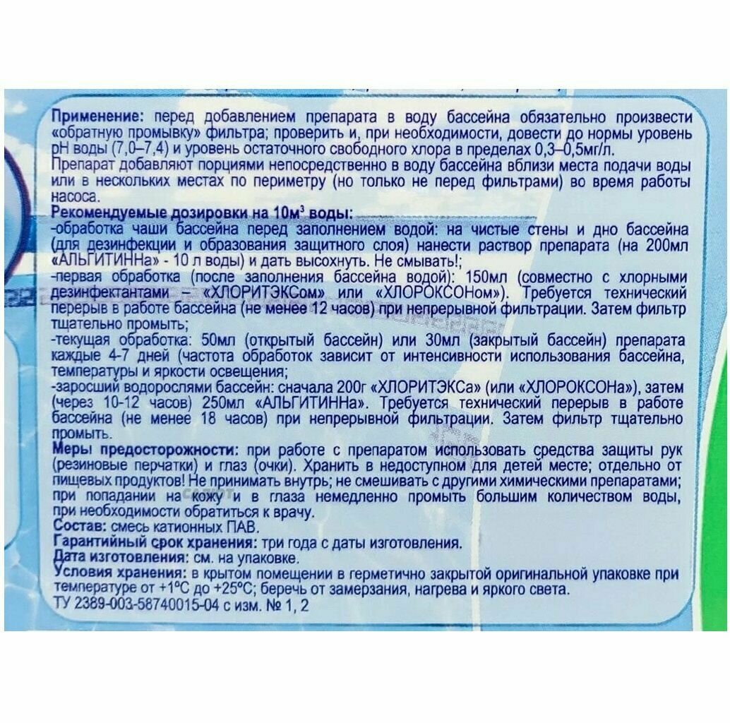 Жидкое средство для обработки плавательных бассейнов альгитинн (предотвращает рост водорослей), 1л.